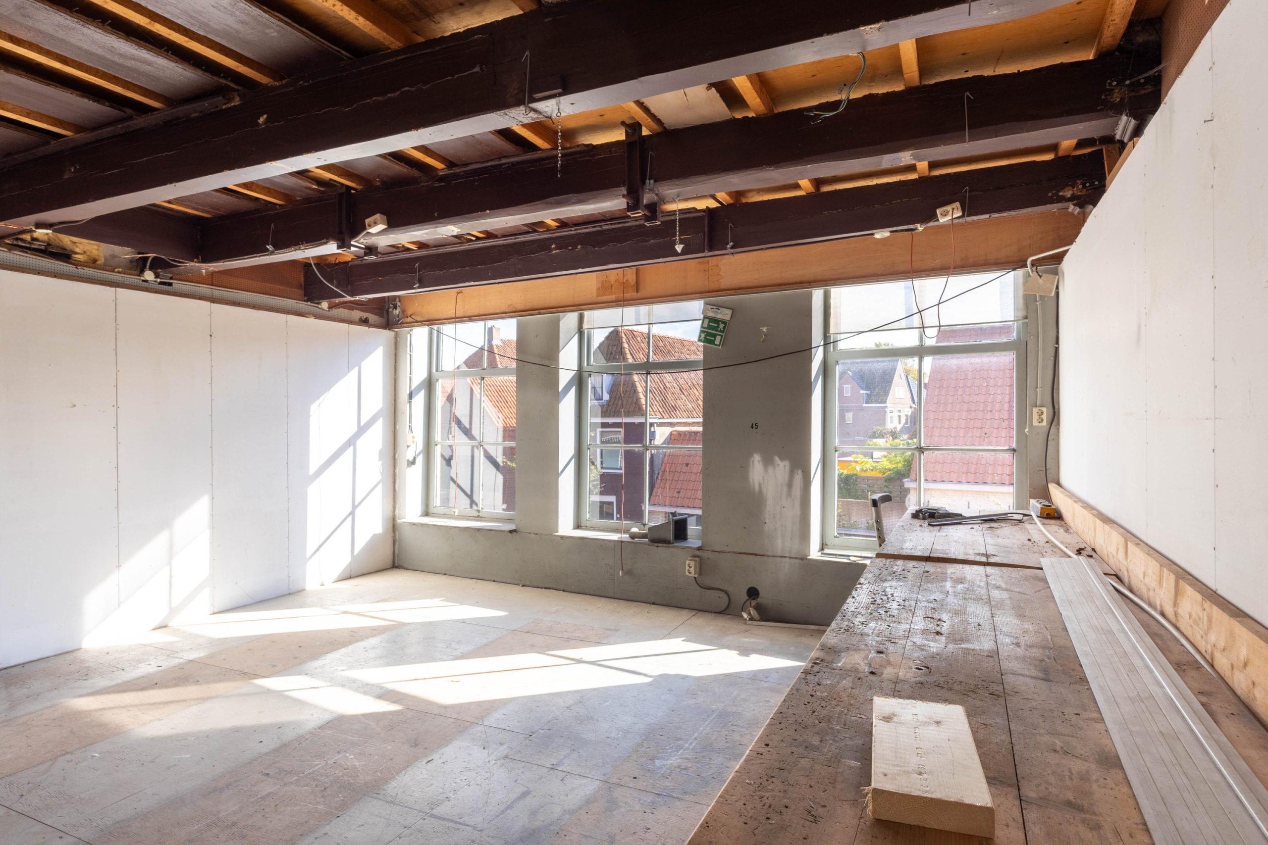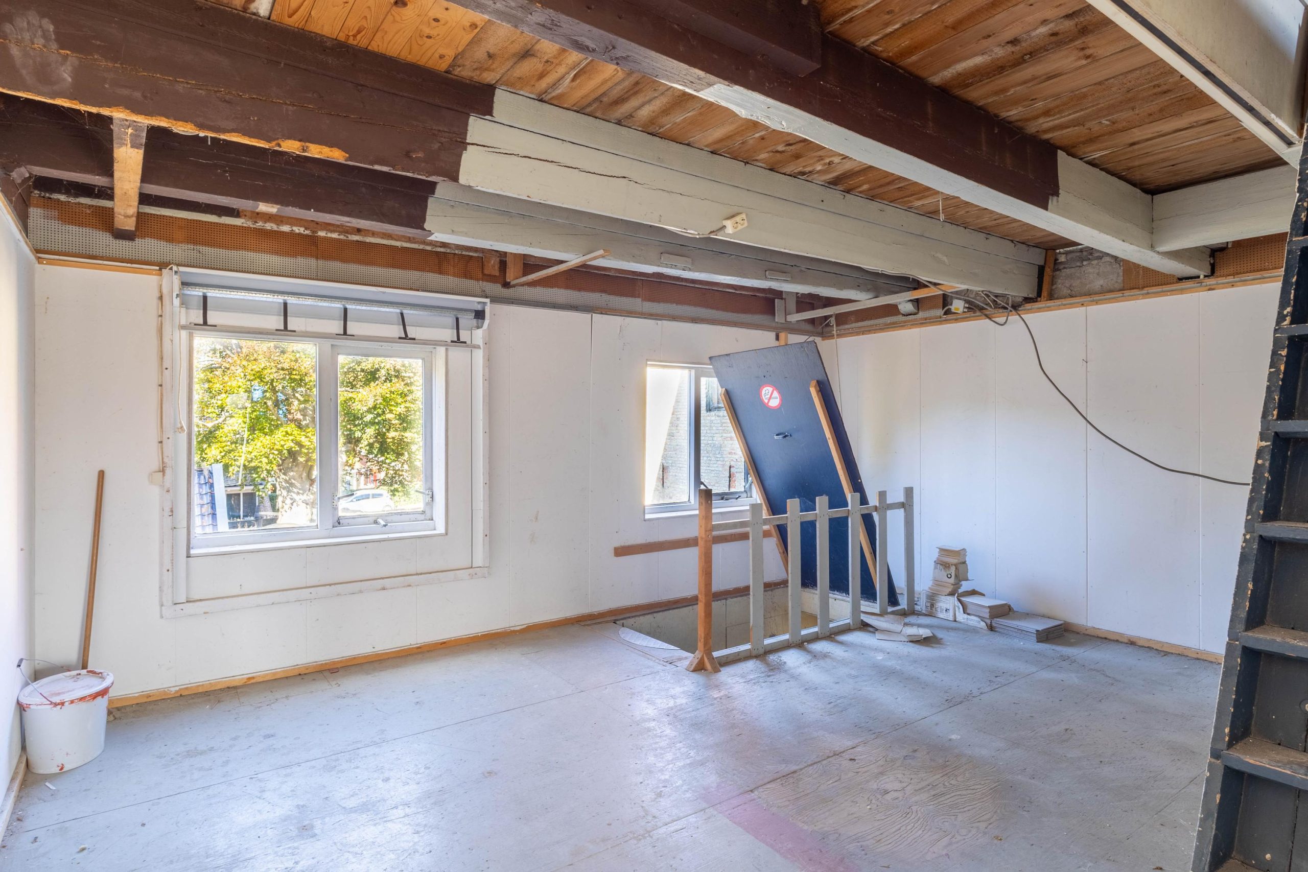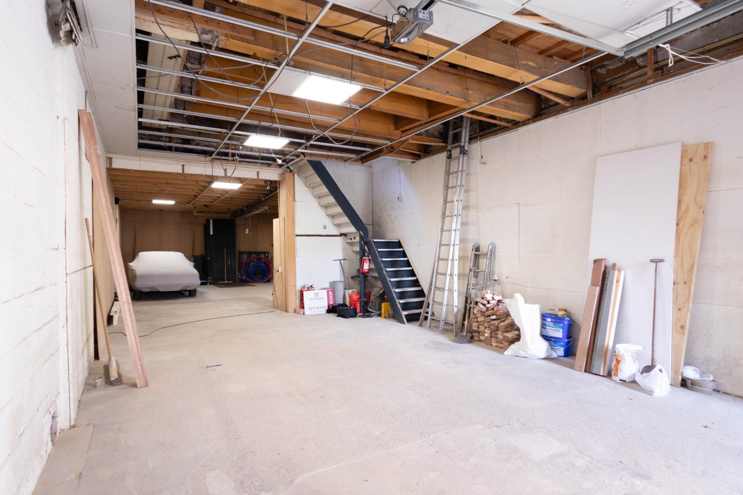 De foto’s liegen er niet om, dit object heeft wat werk nodig, maar potentie en mogelijkheden zijn er zeker. De garage op de begane grond meet een zeer ruime 124m2 en kan binnen het bestemmingsplan ook voor zakelijke doeleinden ingezet worden. De meter kast en de aansluitingen zijn recent geheel vernieuwd en dus klaar om verder uitgebreid te worden. Verder zijn er nog geen installaties aanwezig. De verdieping en de zolder zijn verder zo goed als casco en kunnen volledig naar wens aangekleed worden. Bovenop het platte dak van de garage is een ruim dakterras te realiseren van maar liefst (ca.) 62m2. Nog een mooi pluspunt; het dak is al eens vernieuwd, hier zult u derhalve geen asbest meer aantreffen!