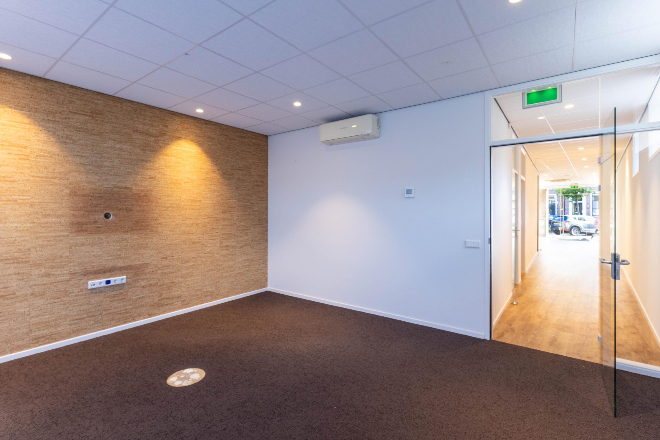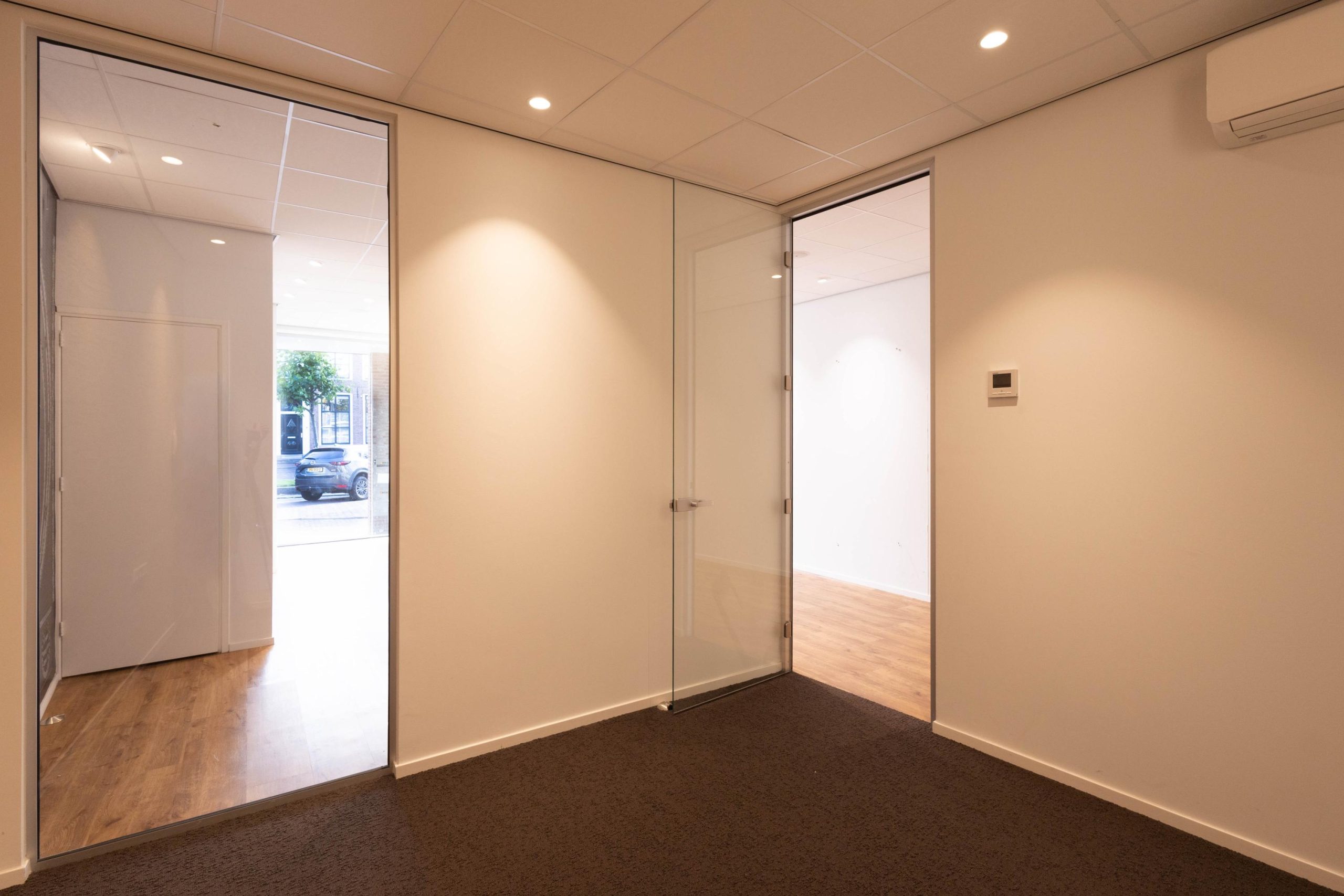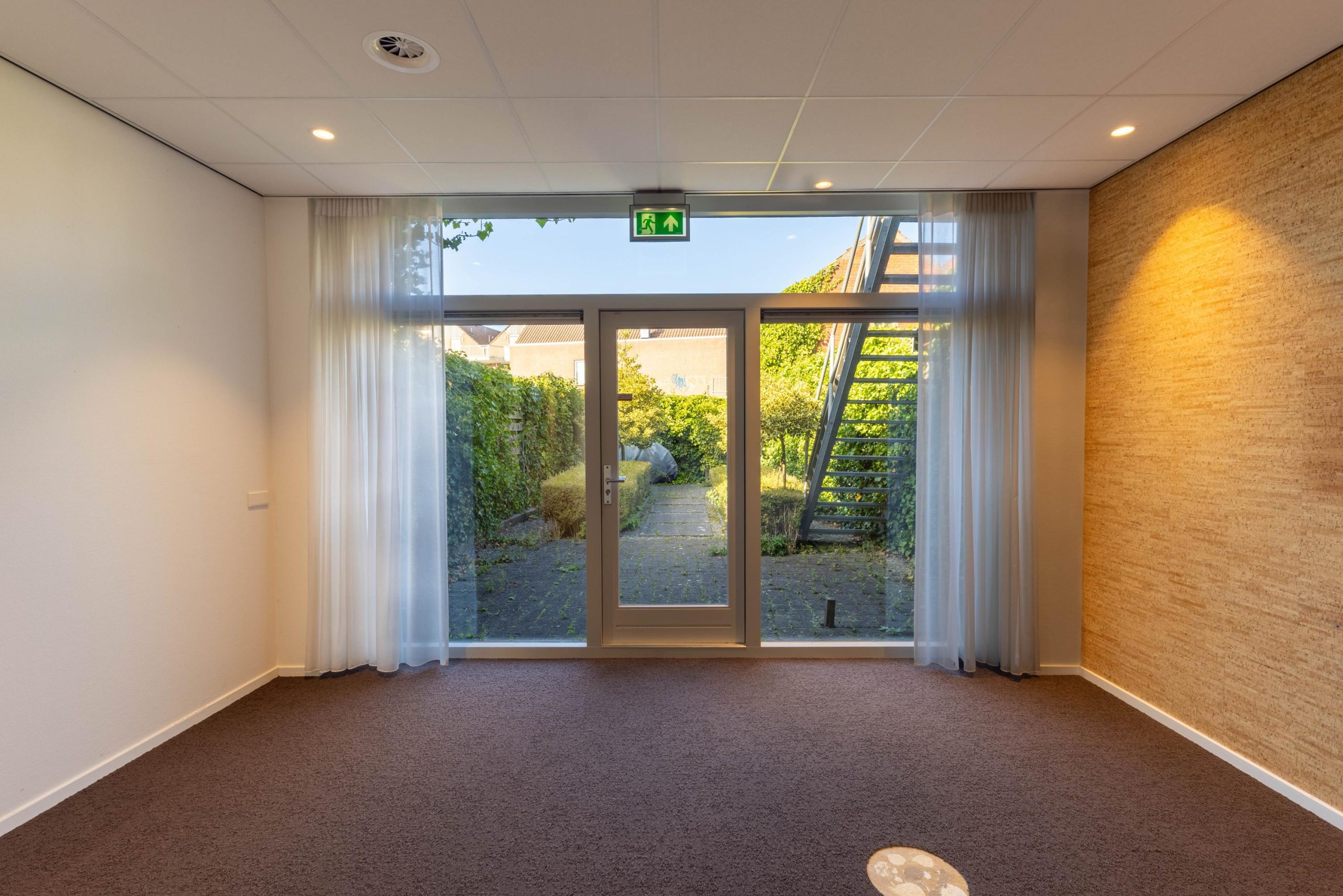 Indeling: balie/receptie, inloopkast/garderobe, trapkast met patchkast, open werkplekken, kantoor I (ca. 10 m2), kantoor II (ca. 9m3) tussen hal met toilet en keuken (ca. 6 m2), ruime spreekkamer/kantoor (ca. 20 m2) met deur naar de tuin.