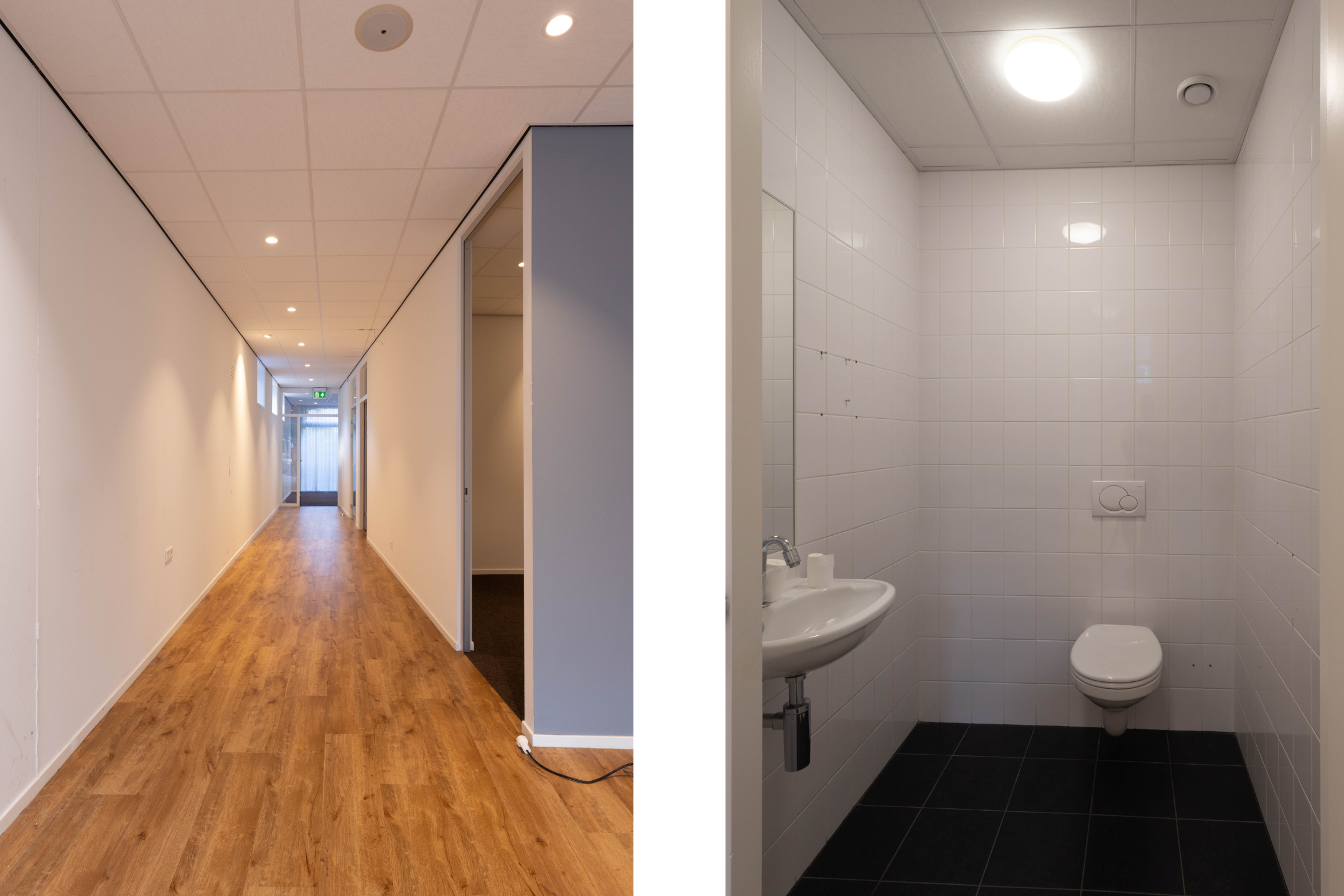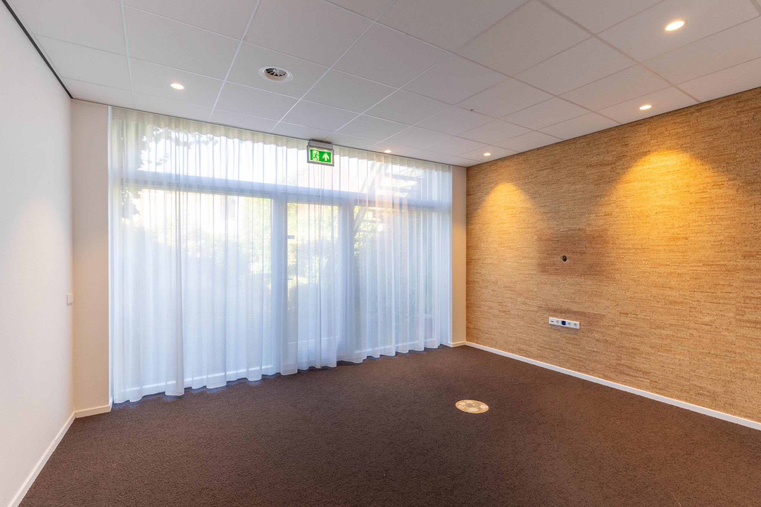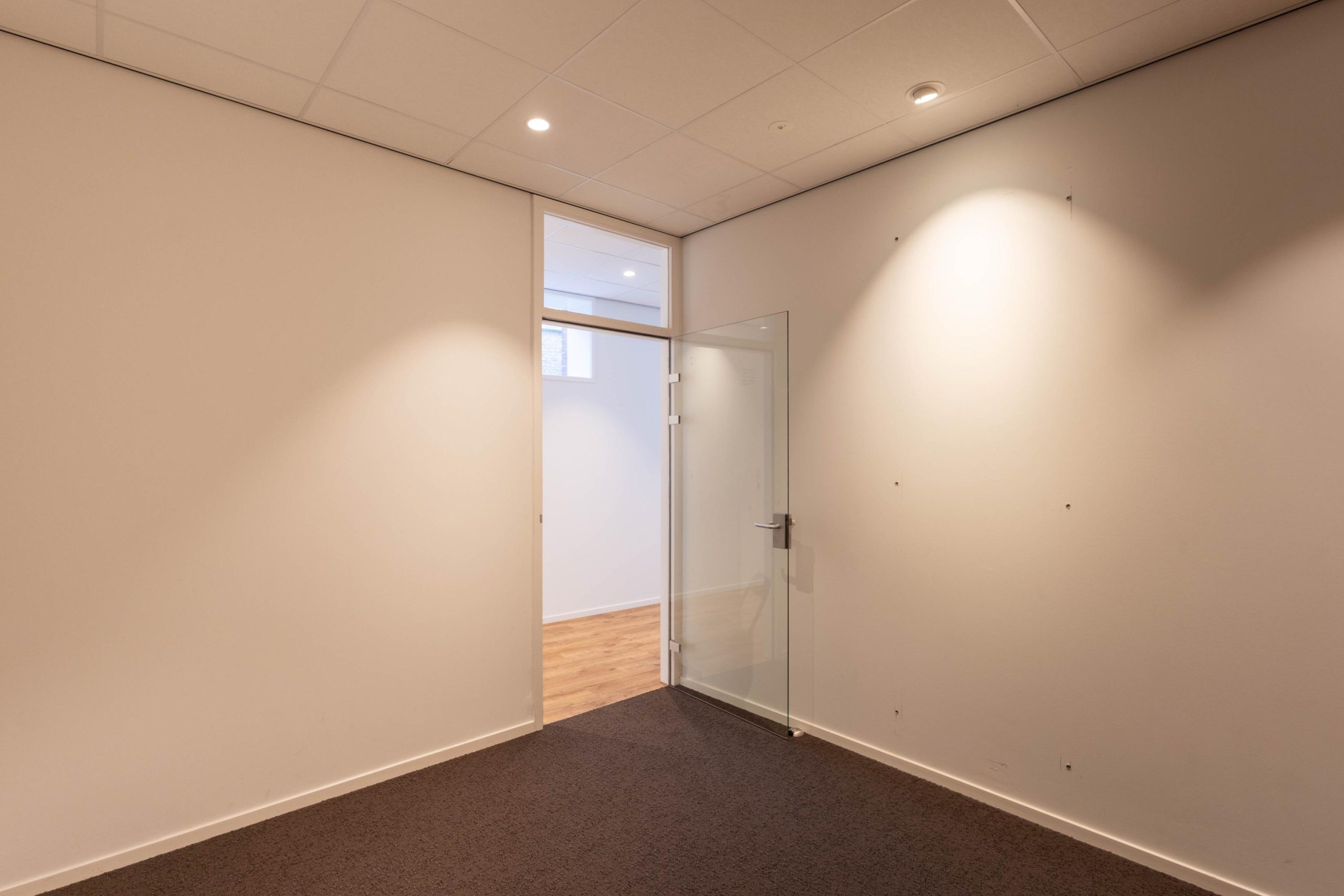 Indeling: balie/receptie, inloopkast/garderobe, trapkast met patchkast, open werkplekken, kantoor I (ca. 10 m2), kantoor II (ca. 9m3) tussen hal met toilet en keuken (ca. 6 m2), ruime spreekkamer/kantoor (ca. 20 m2) met deur naar de tuin.