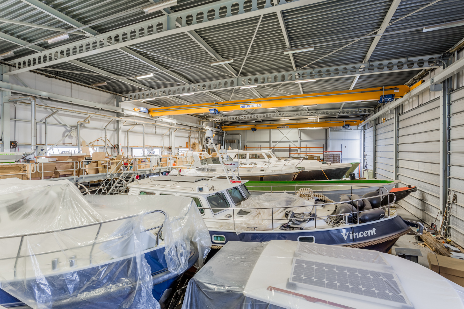 De bedrijfshal meet 103 x 25,50 m1 (exclusief het luifel/ portaal van 25,5 x 3,5 m1) met een hoogte van 10,50 m1 en bestaat uit 12 spantvakken van ca. 8,5 m1, waarvan in één spantvak (zuidzijde) de drielaagse kantoorruimten zijn gevestigd met aangrenzend de vijf geschakelde open ruimten met 201 m2 aan entresol vloer t.b.v. de houtbewerking. Daar aansluitend is de bedrijfsruimte ingericht als spuitloods, met aansluitend weer vijf spantvakken als bedrijfsruimte. Op de kantoorruimte na heeft elk spant vak een elektrische overheaddeur van 7,85 breed en 8,0 m1 hoog.
