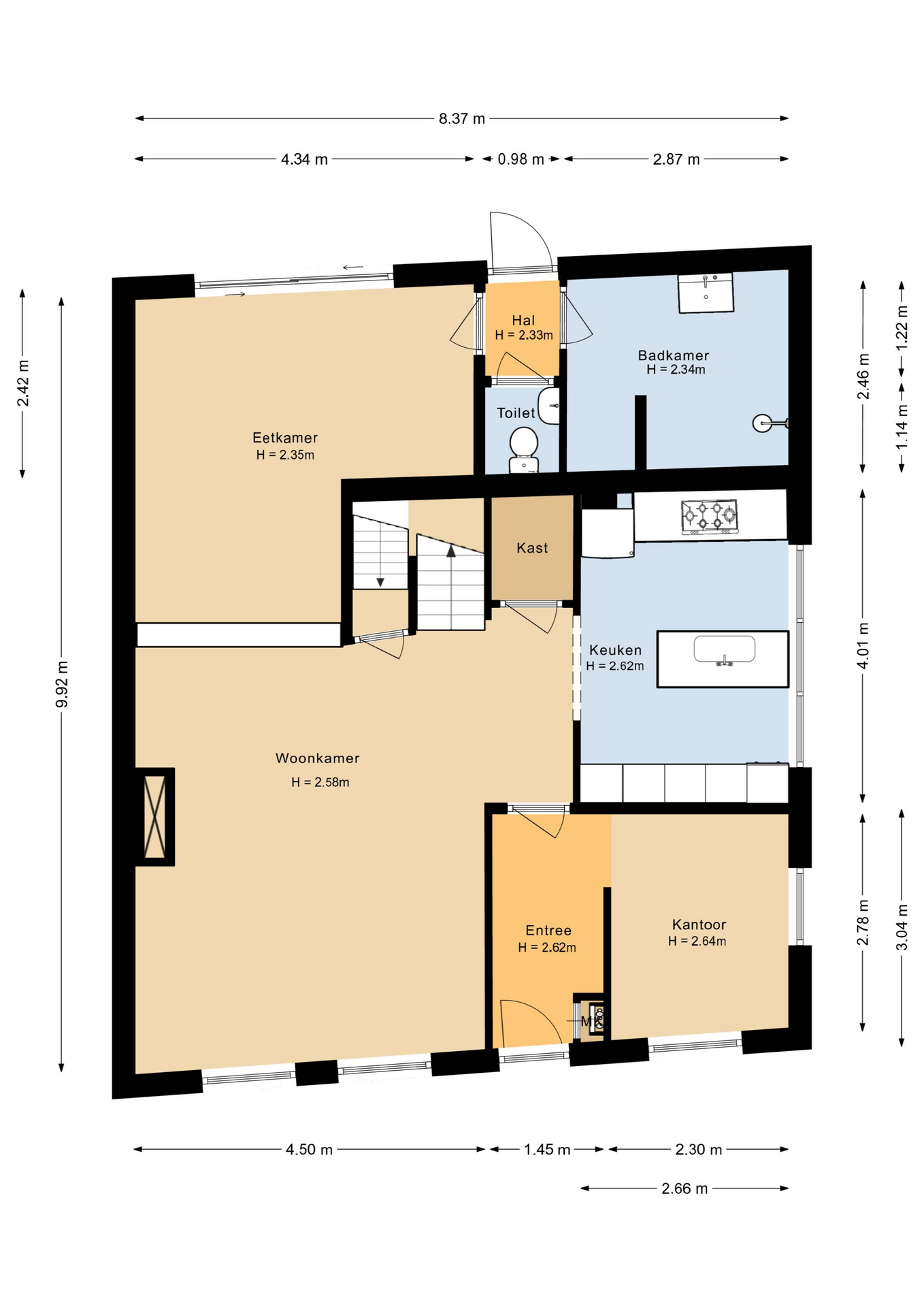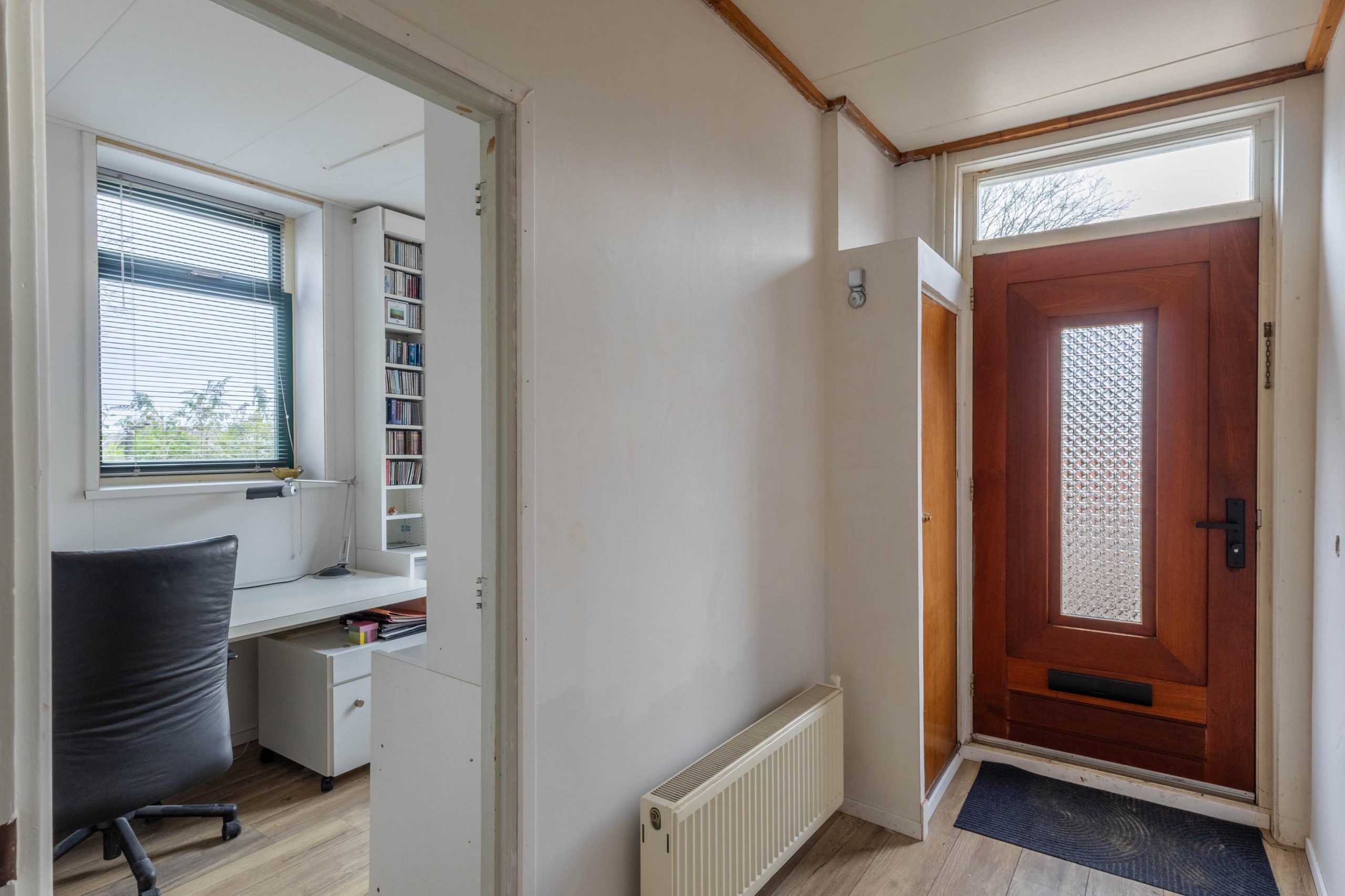 Entree/hal met meterkast en toegang tot een compacte slaap- en/of werkkamer. Vanuit de hal bereiken we de L-vormige woonkamer, die is voorzien van een open haard, een grote raampartij aan de voorzijde en een schuifpui naar de achtertuin. De halfopen keuken beschikt over een praktische opstelling met spoeleiland en is voorzien van diverse inbouwapparatuur en een koel-/vriescombinatie.