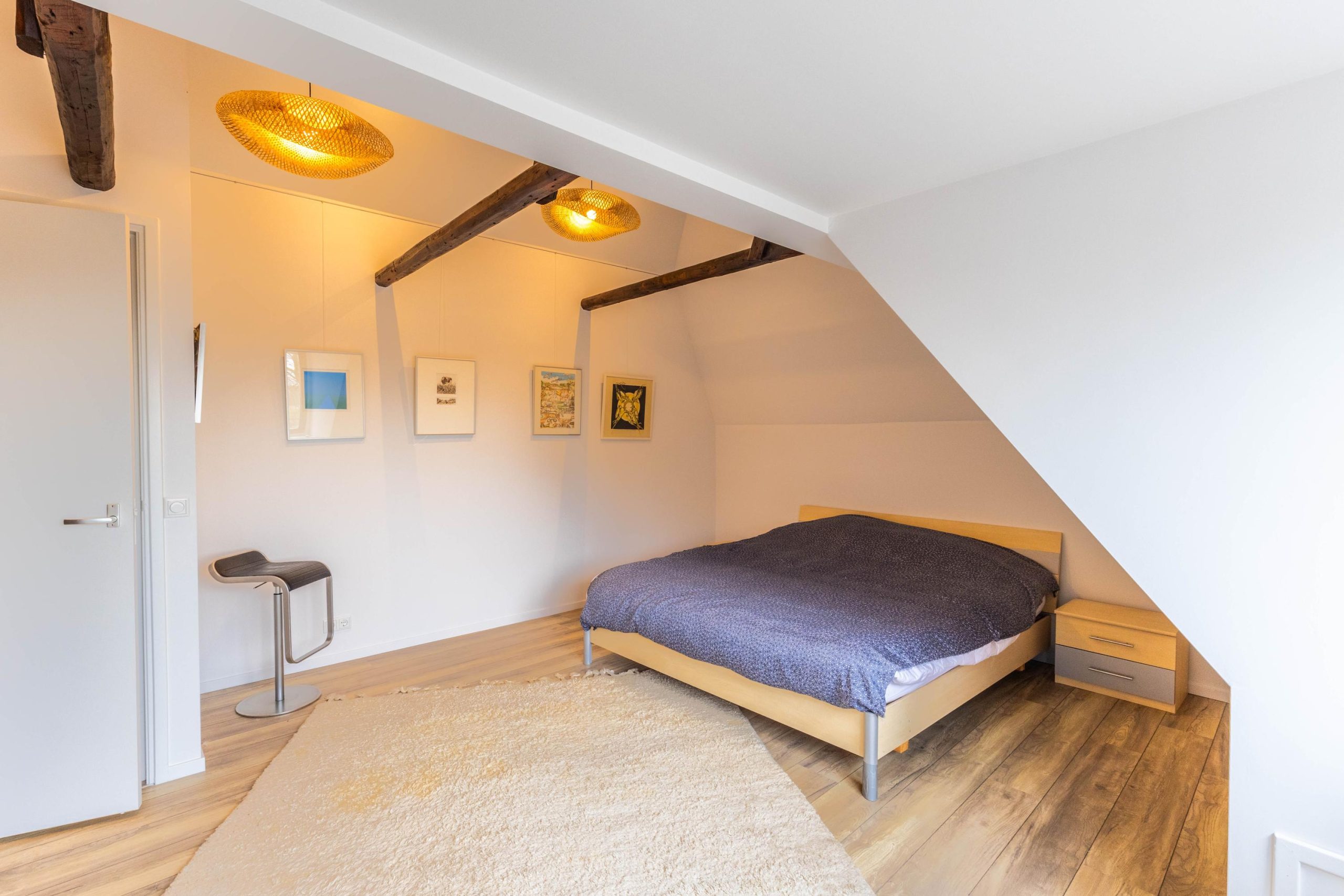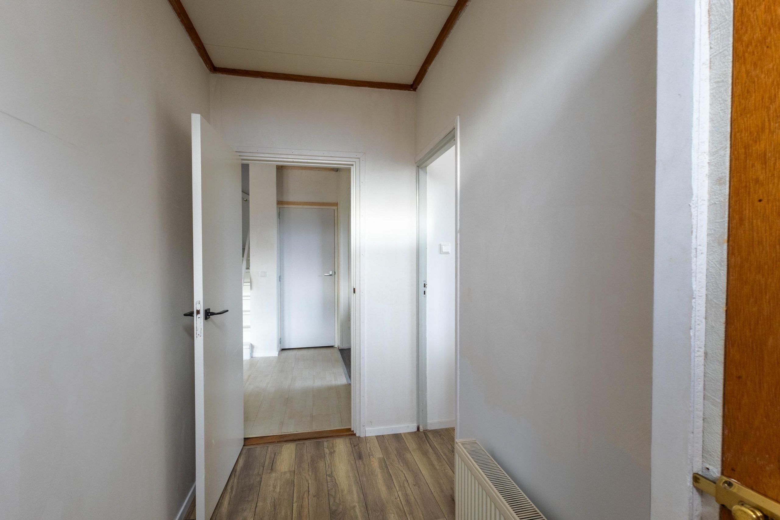Via de vaste trap nabij de keuken bereiken we de overloop met toegang tot drie slaapkamers.