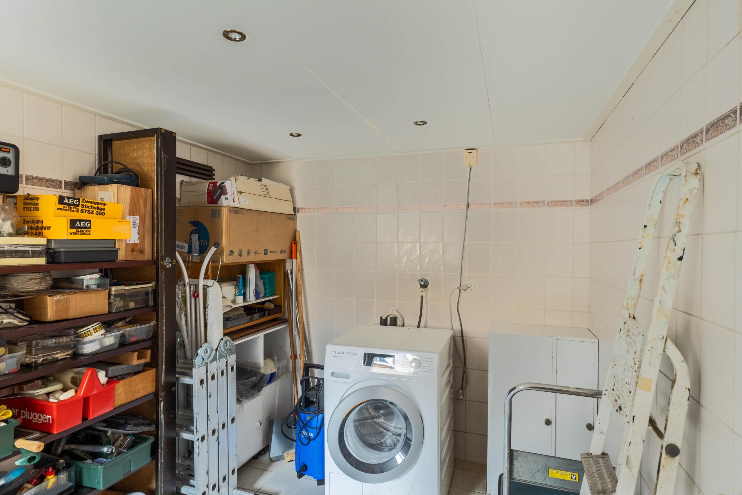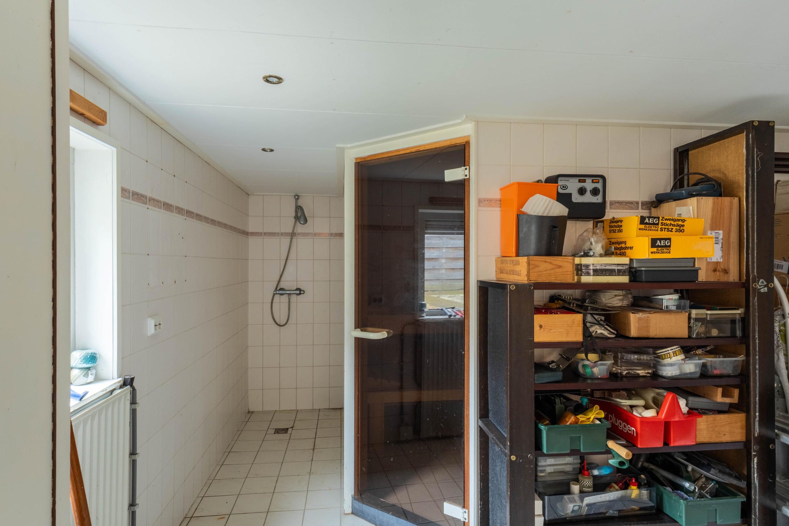 De vrijstaande stenen berging is ingericht als saunaruimte en beschikt over aansluitingen en afvoer voor de witgoedopstelling. Hiervoor is een tweede groepenkast aangebracht. Tevens bevindt zich hier de HR-combiketel.