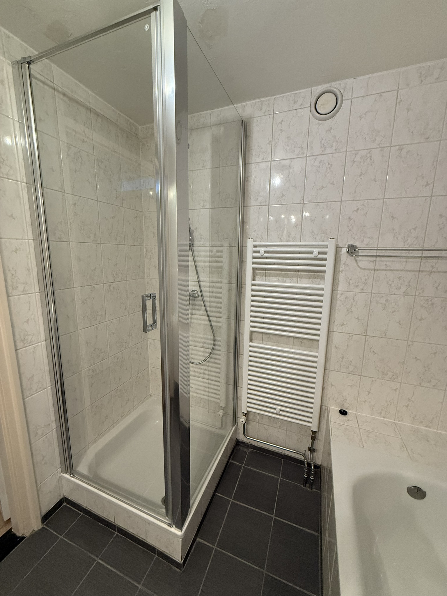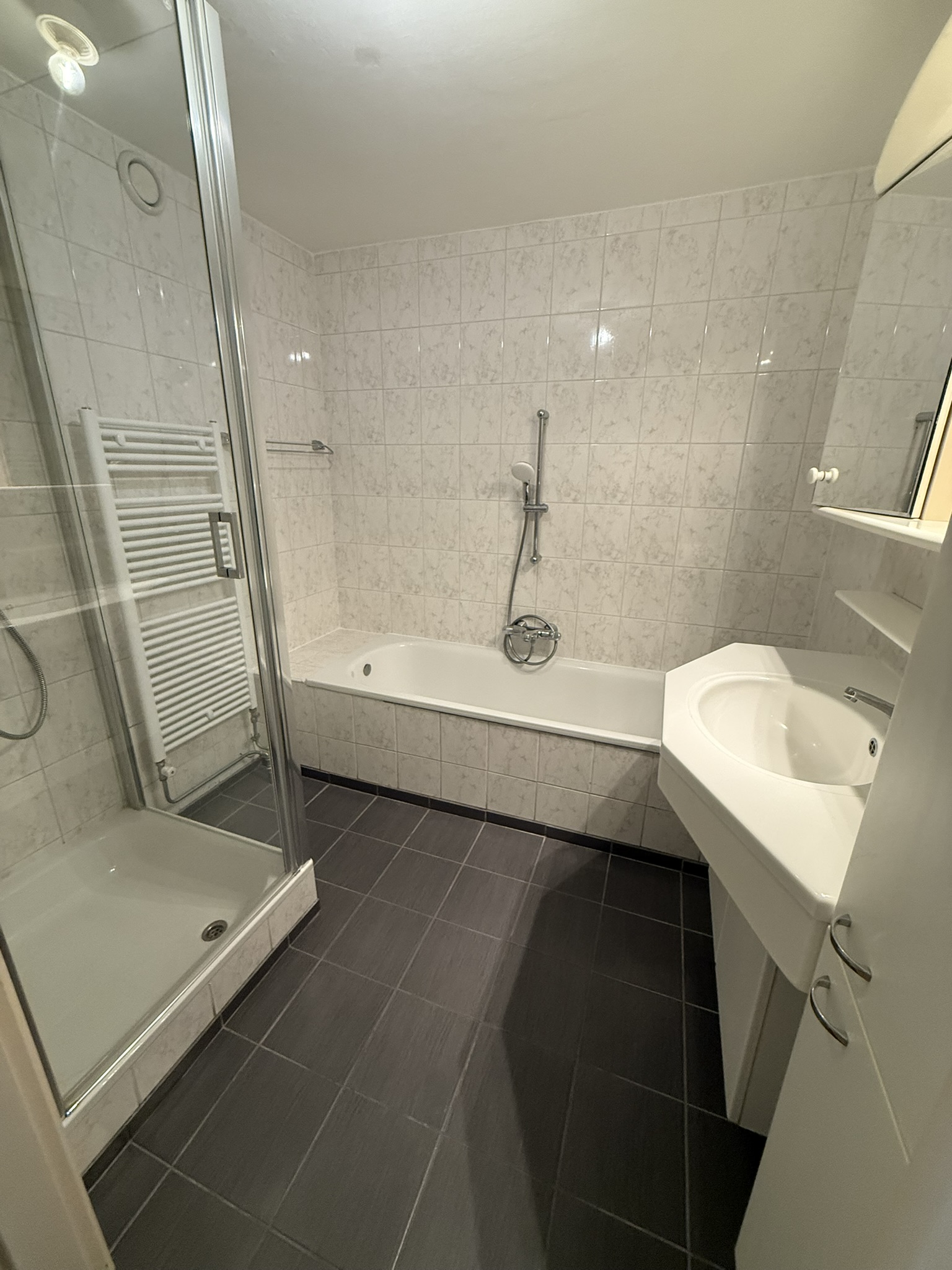 De badkamer is voorzien van een douche, ligbad, wastafelmeubel en grote spiegel.