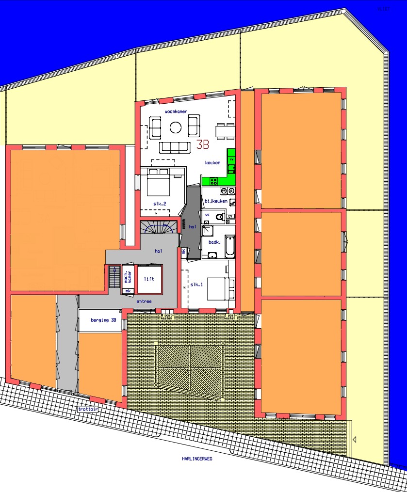 Het appartement Harlingerweg 3B is één van de in 1998 11 nieuw ingebouwde appartementen in het rijksmonument “De Drie Pakhuizen”, nabij de binnenstad van Franeker en grenzend aan het onlangs gerenoveerde uitgestrekte stadspark van Franeker.