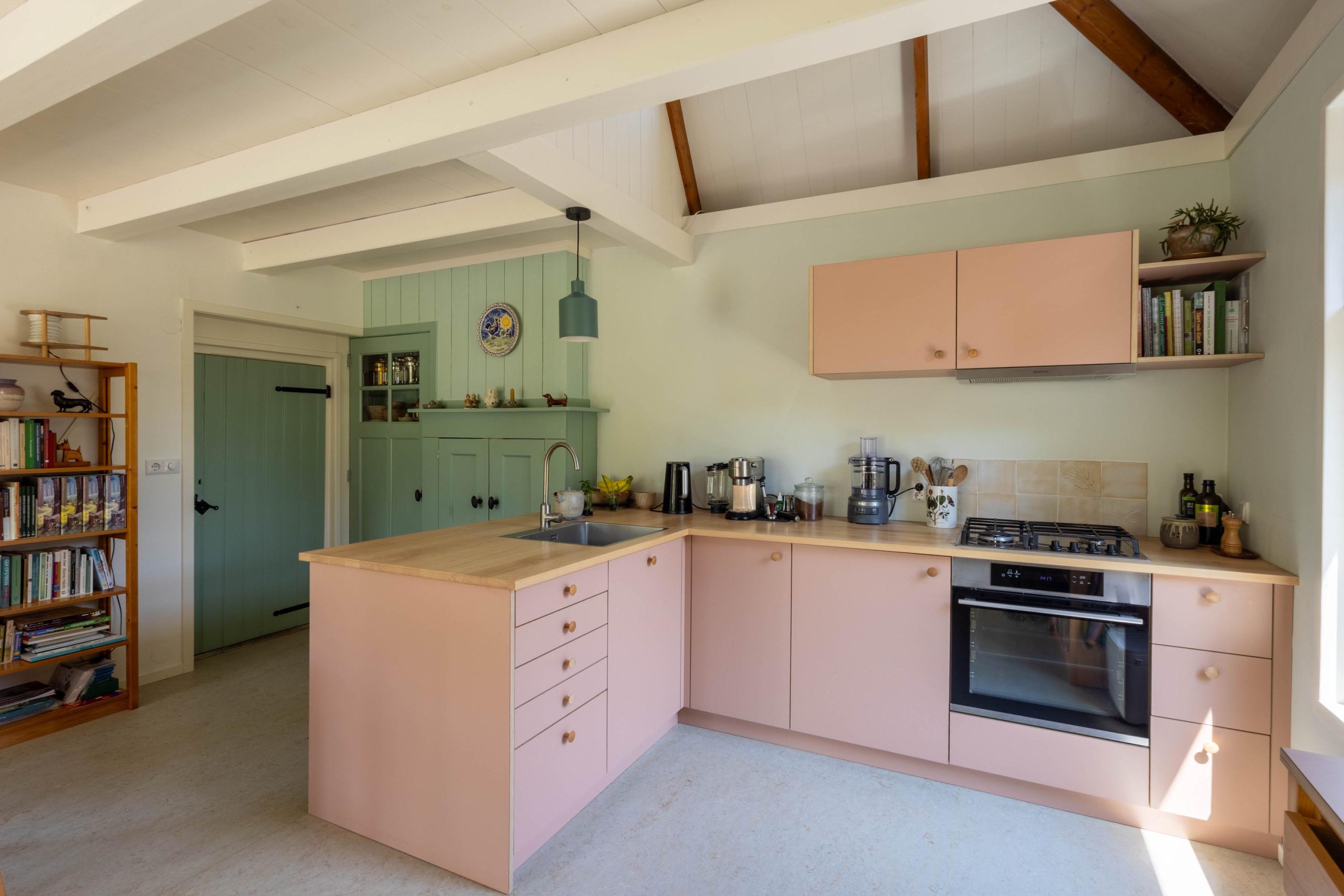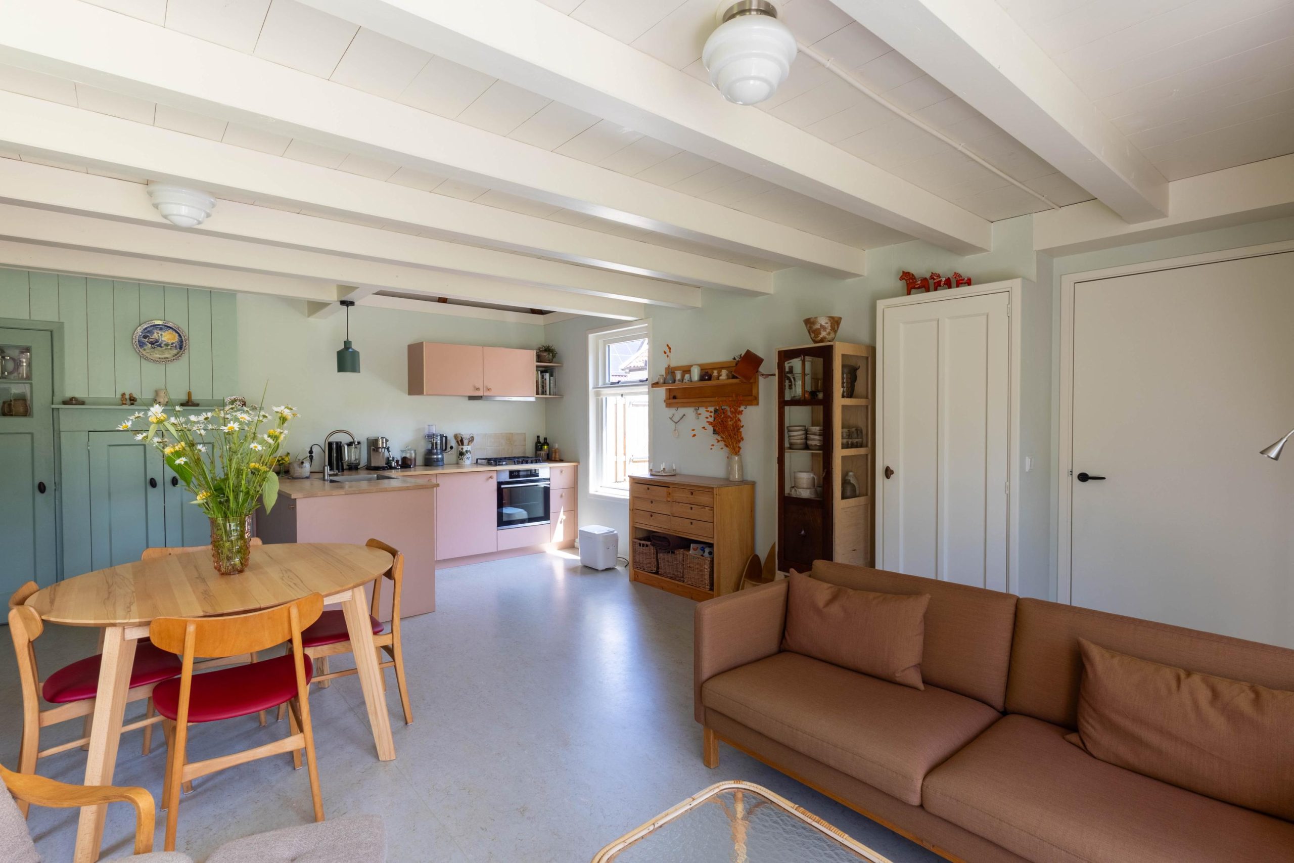 Centrale hal/entree met meterkast en diverse vaste kasten, opgang naar de verdieping. Ruime slaapkamer van ca. 18 m² met een grote raampartij en uitzicht op de tuin. Ruime badkamer met ligbad, inloopdouche, toilet en wastafel, met daaronder aansluiting voor de wasmachine en droger. Verder een ruime, tuingerichte living met openslaande deuren, een gezellige houtkachel en een open keuken. Deze sfeervolle ruimte is gerenoveerd met behoud van authentieke elementen zoals het balkenplafond en schuur- en paneeldeuren. De keuken heeft een hoekopstelling met diverse inbouwapparatuur en een vide erboven, wat zorgt voor een ruimtelijk gevoel.