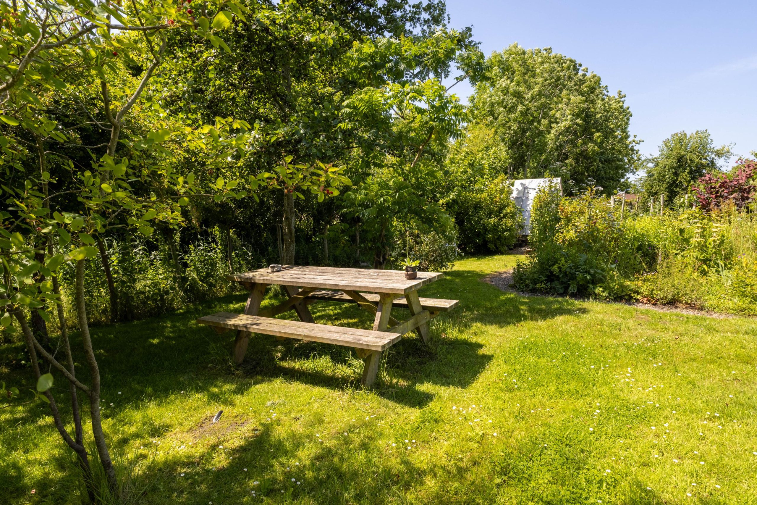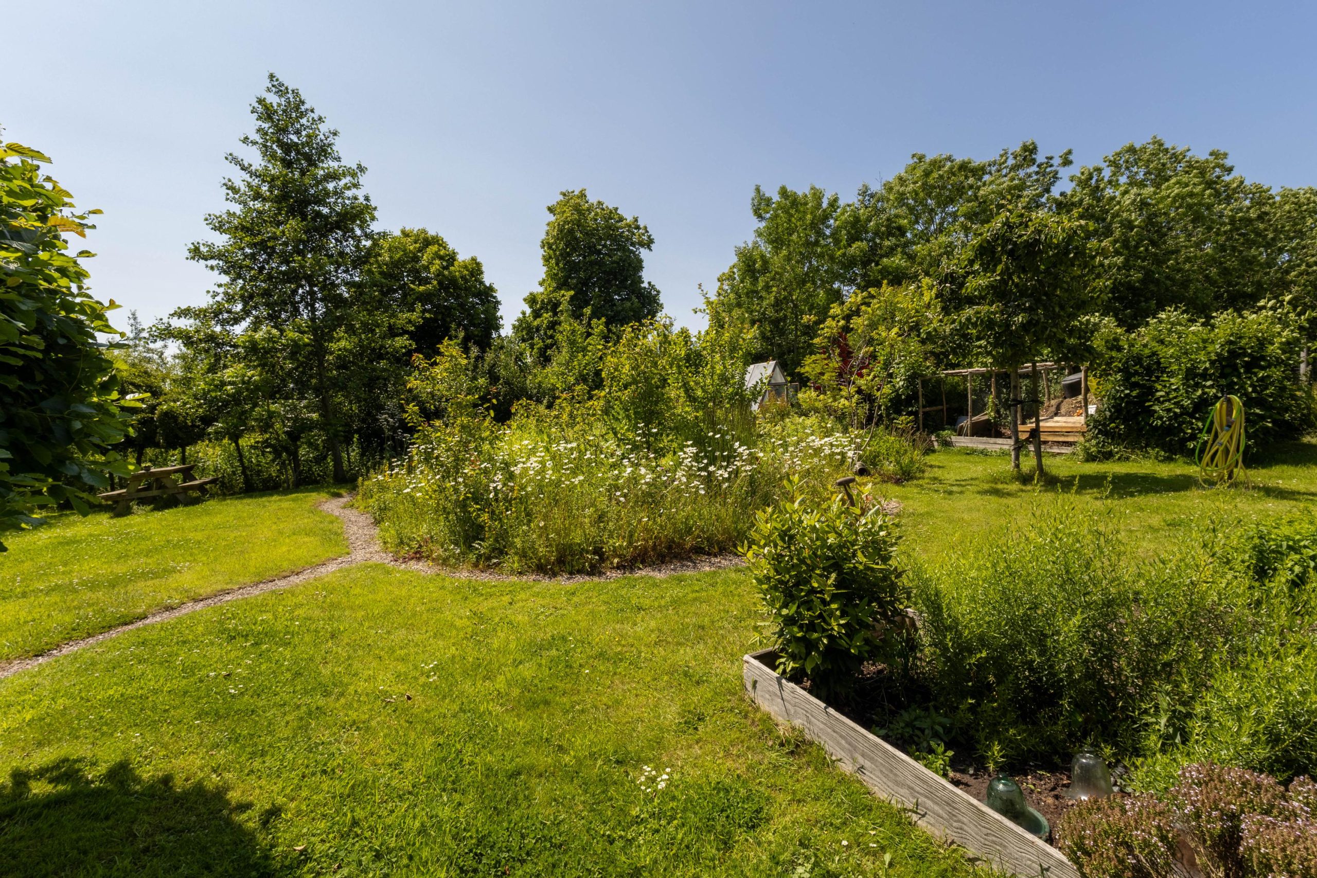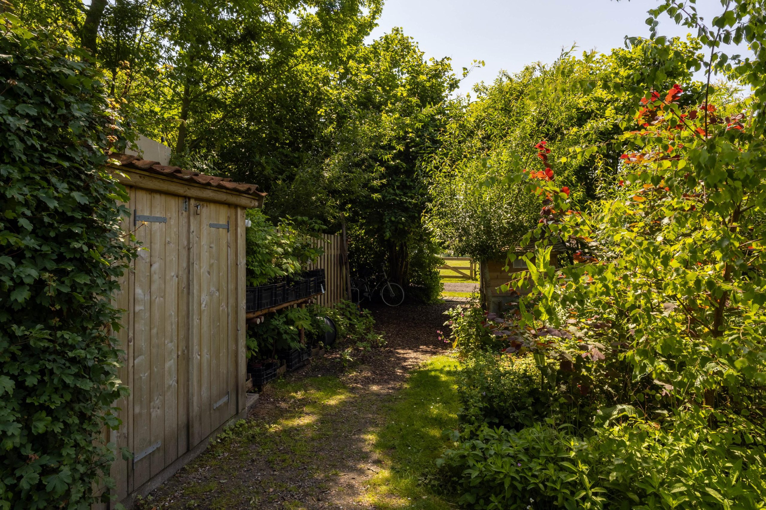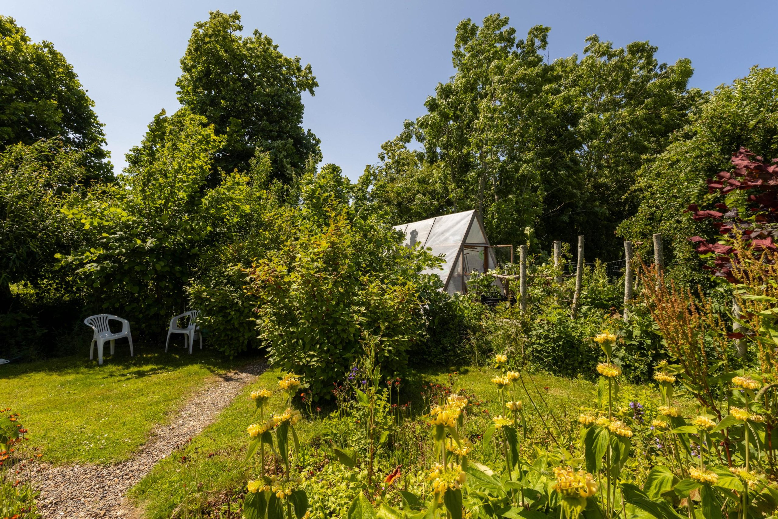 In 2023 is het aangrenzende grasveld van 6.504 m² aangekocht. Dit terrein kan worden gebruikt voor bijvoorbeeld het houden van kleinvee, maar ook een permacultuurtuin of een grote moestuin behoort tot de mogelijkheden. Momenteel grazen hier de schapen van een boer uit het dorp. Langs dit veld loopt een oprijlaan naar de woning, met aan het einde parkeerruimte voor circa 3 tot 4 auto’s.