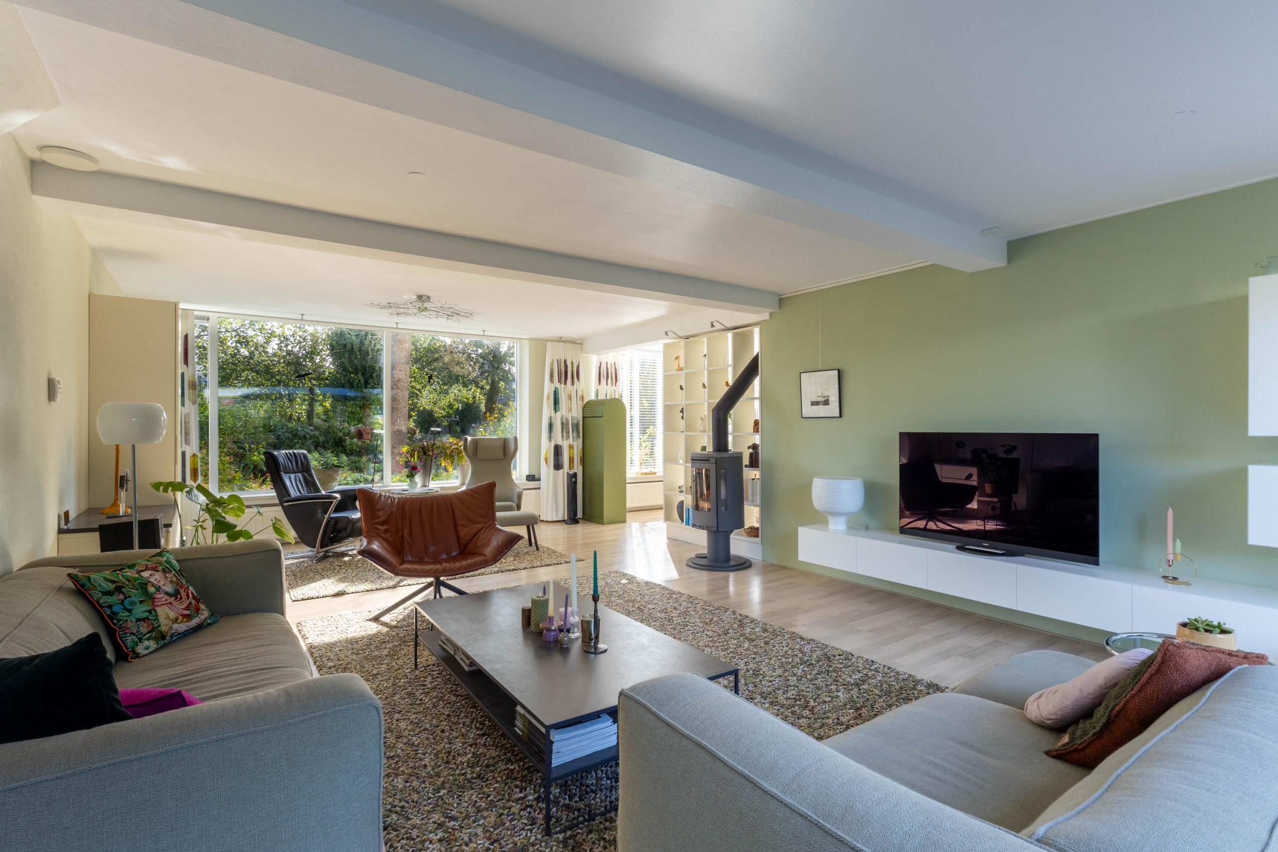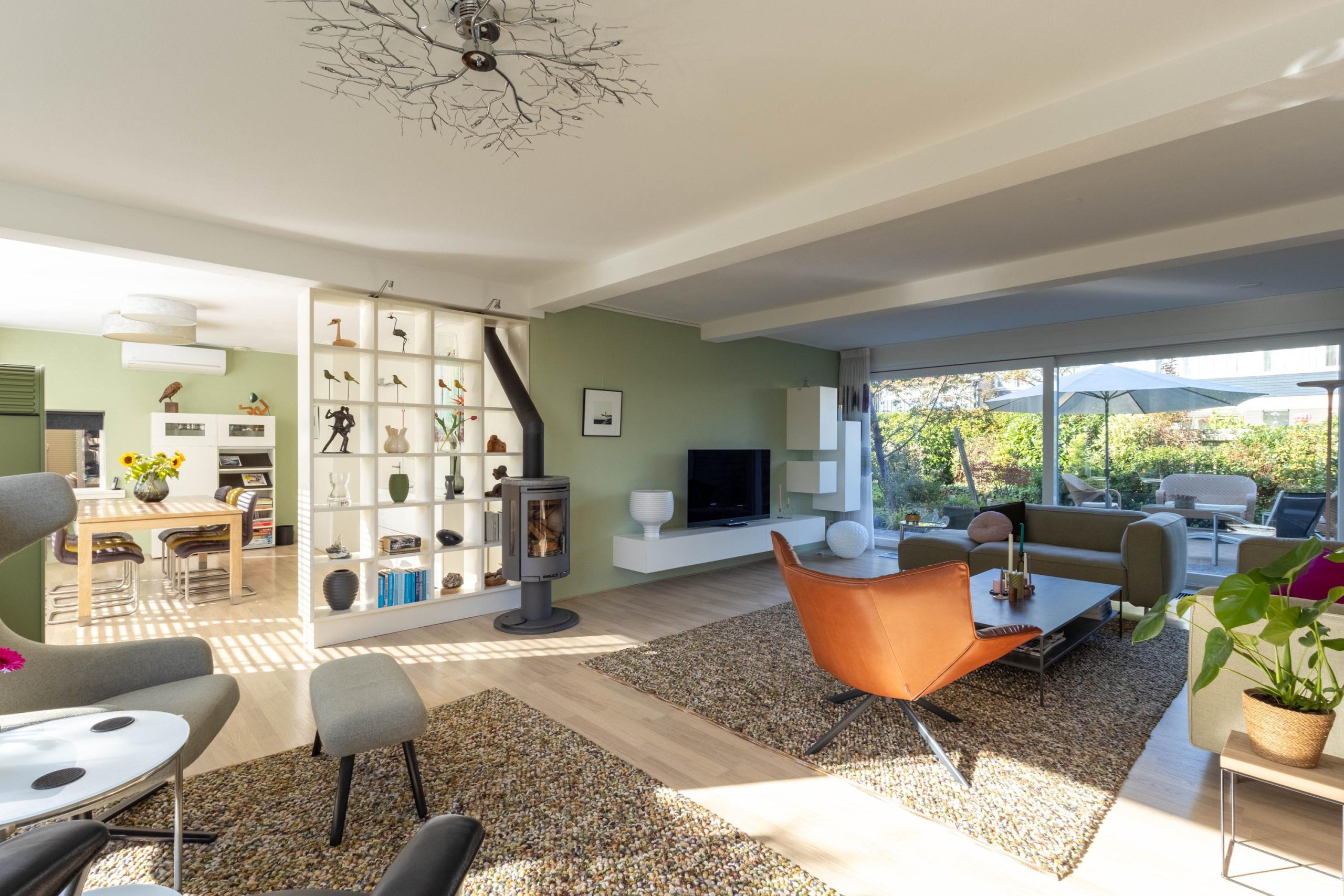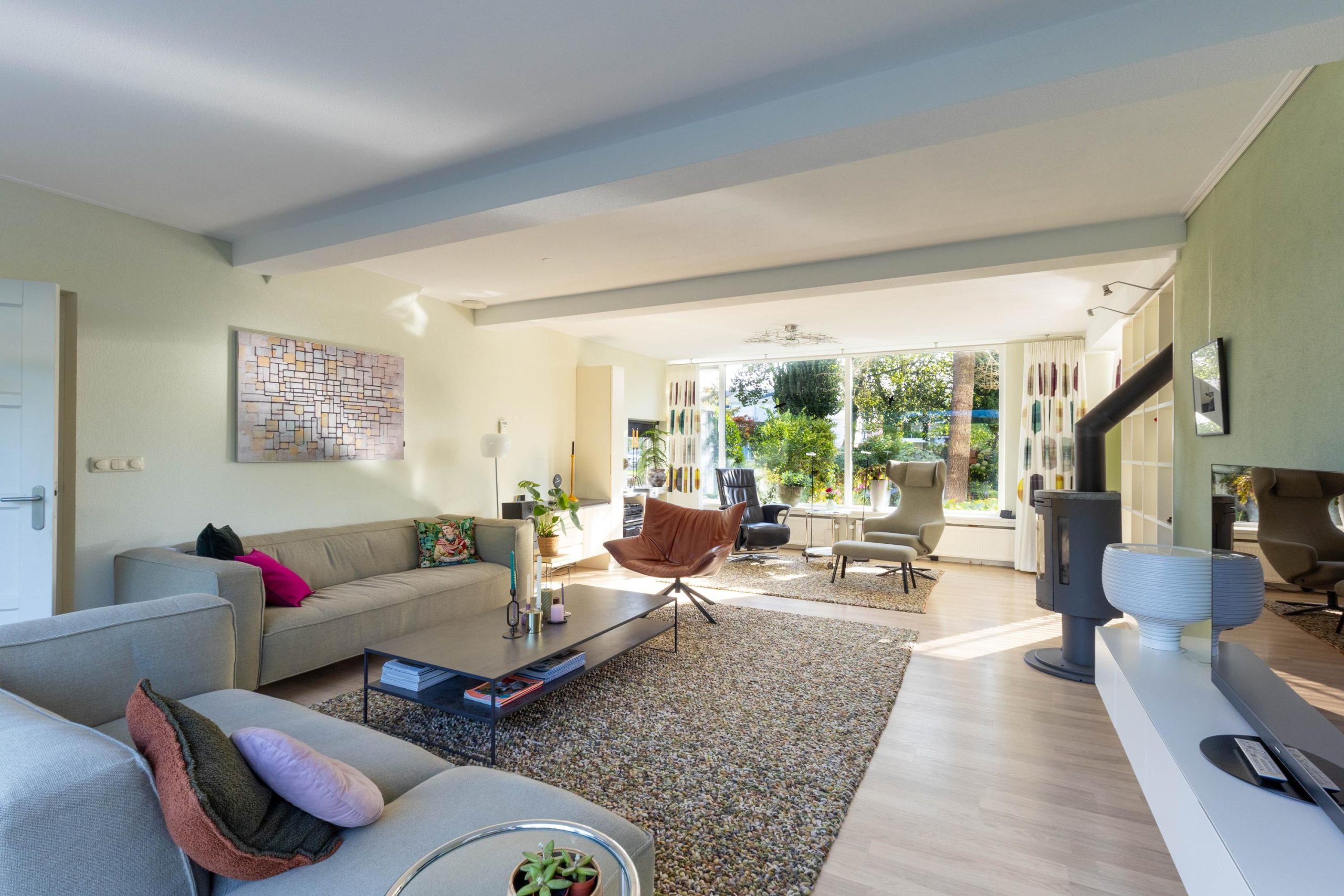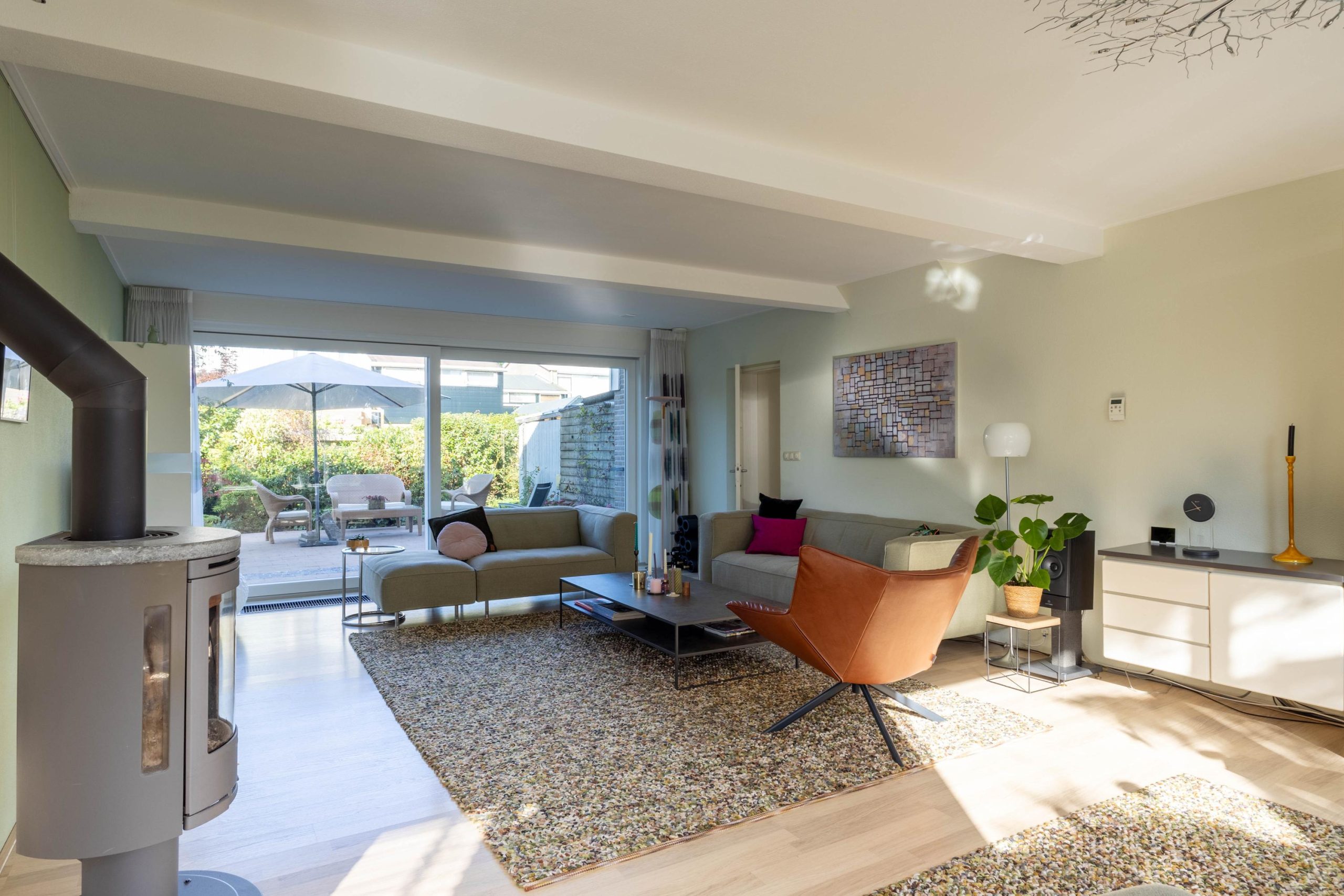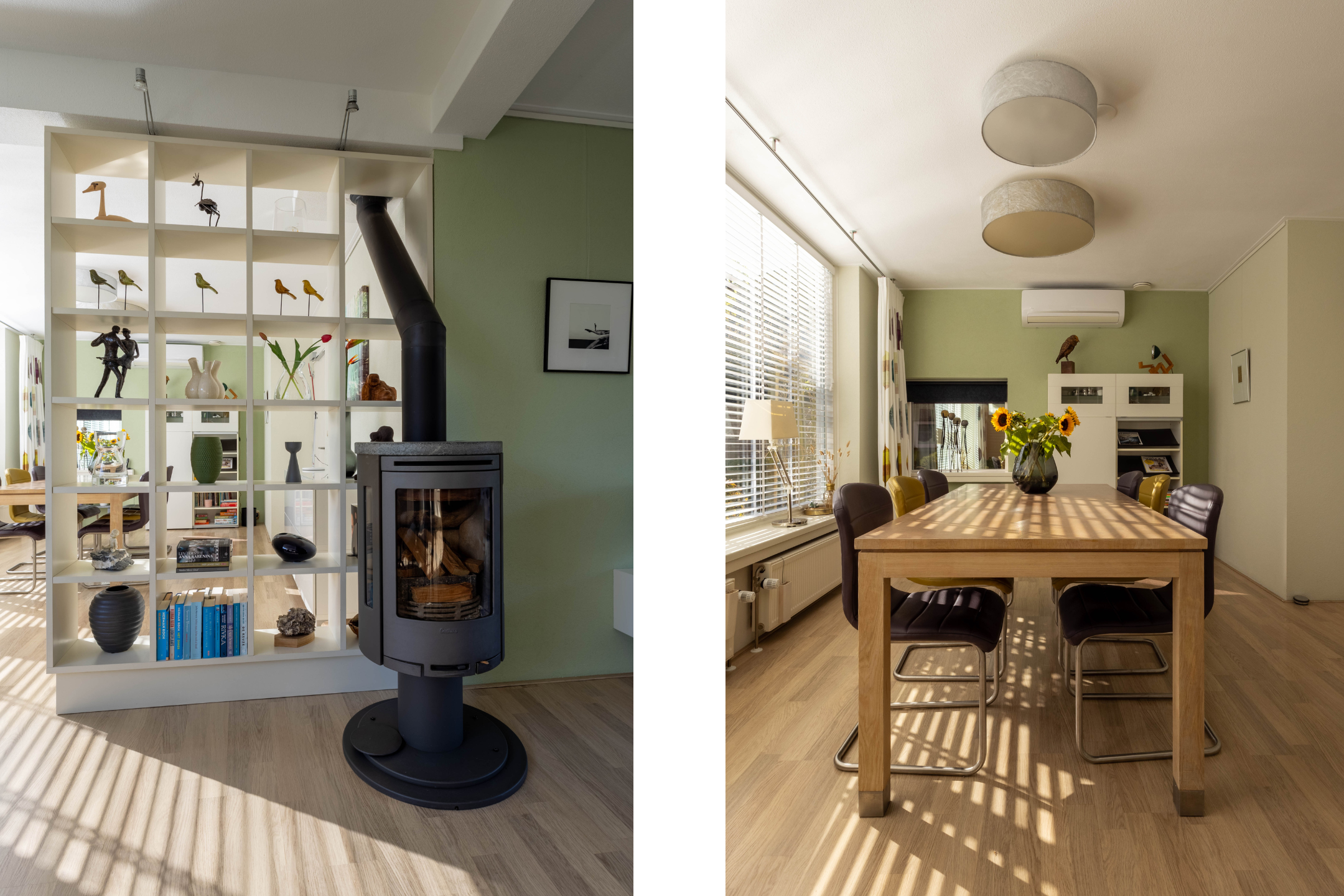 Hal/entree met meterkast, garderobekast en trapopgang naar de verdieping. Ruim toilet met wandcloset en fonteintje. Gesloten keuken met elektrische vloerverwarming en een fraaie hoekopstelling voorzien van diverse inbouwapparatuur, waaronder een 90 cm-inductiekookplaat, afzuigkap, oven, magnetron, vaatwasser en kokendwaterkraan. Aansluitend een ruime berging/bijkeuken met achterentree en aansluitingen voor de witgoedopstelling. De L-vormige woonkamer meet circa 60 m², met volop ruimte voor een royale eettafel en zithoek. Grote raampartijen aan de voorzijde en een brede kunststof schuifpui aan de achterzijde zorgen voor veel lichtinval. In de koudere maanden kunt u hier genieten van de warmte van de sfeervolle houtkachel. Vanuit de hal is er toegang tot de achtertuin en een slaapkamer met badkamer, voorzien van een inloopdouche, tweede toilet en wastafel.