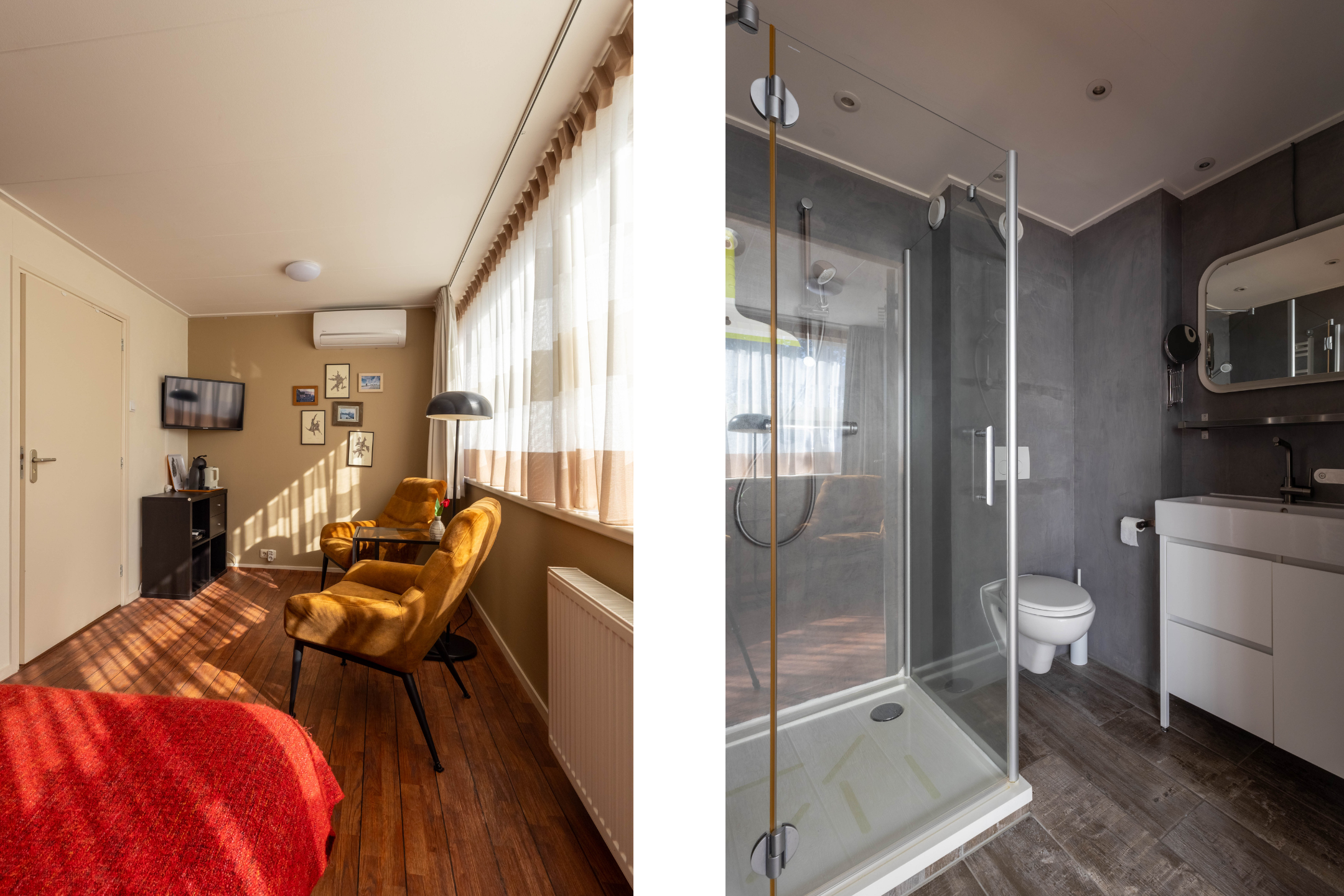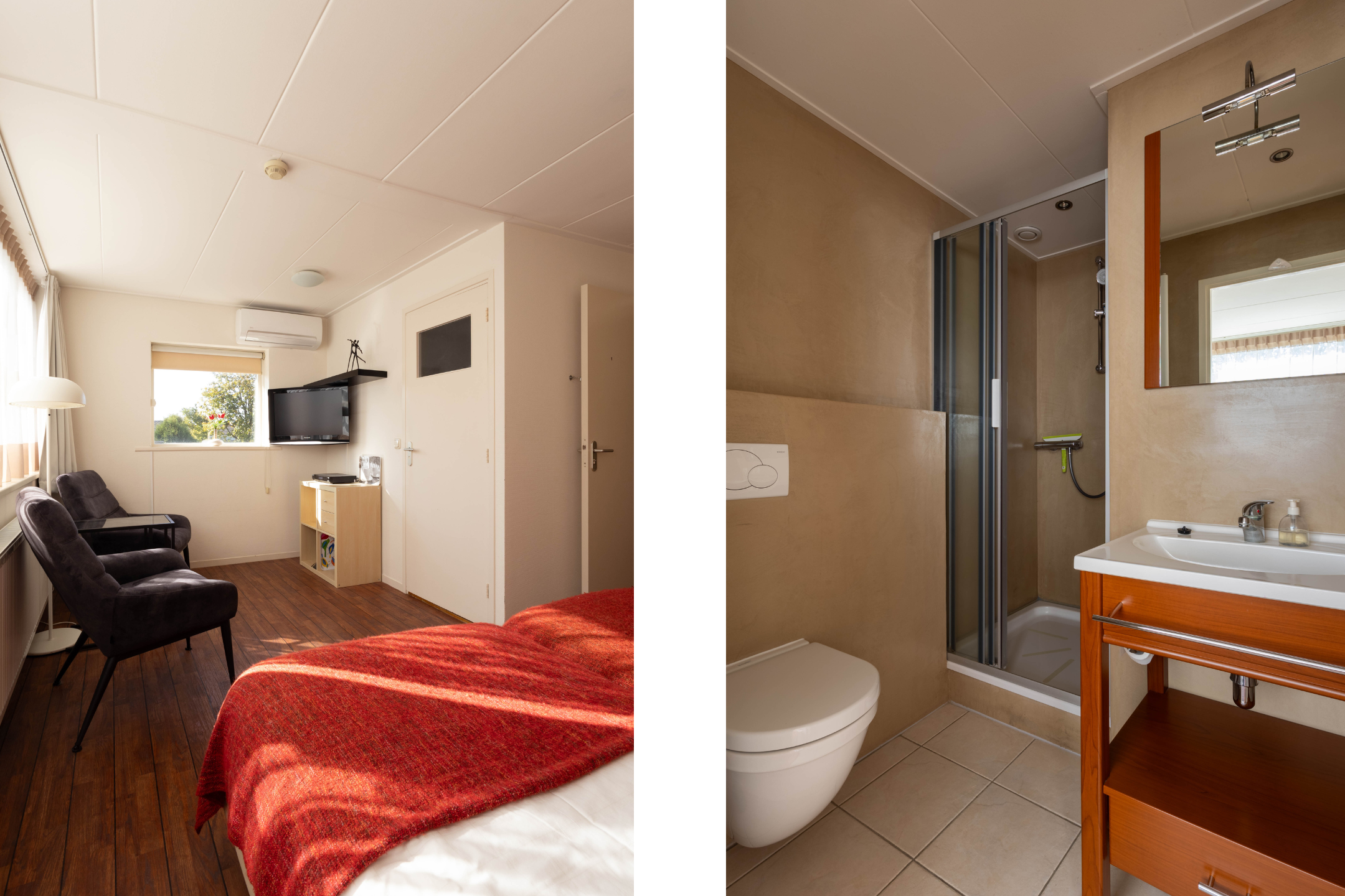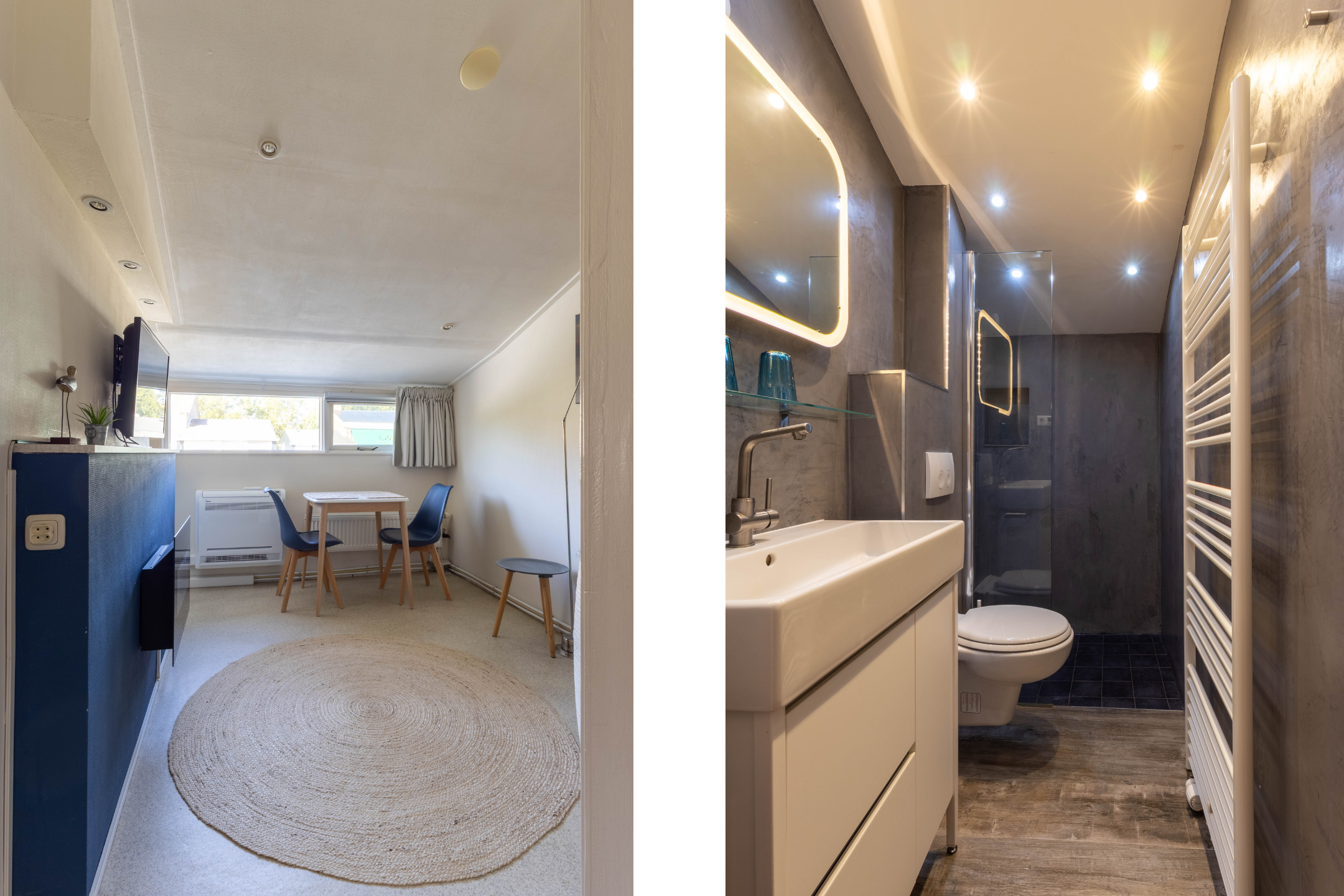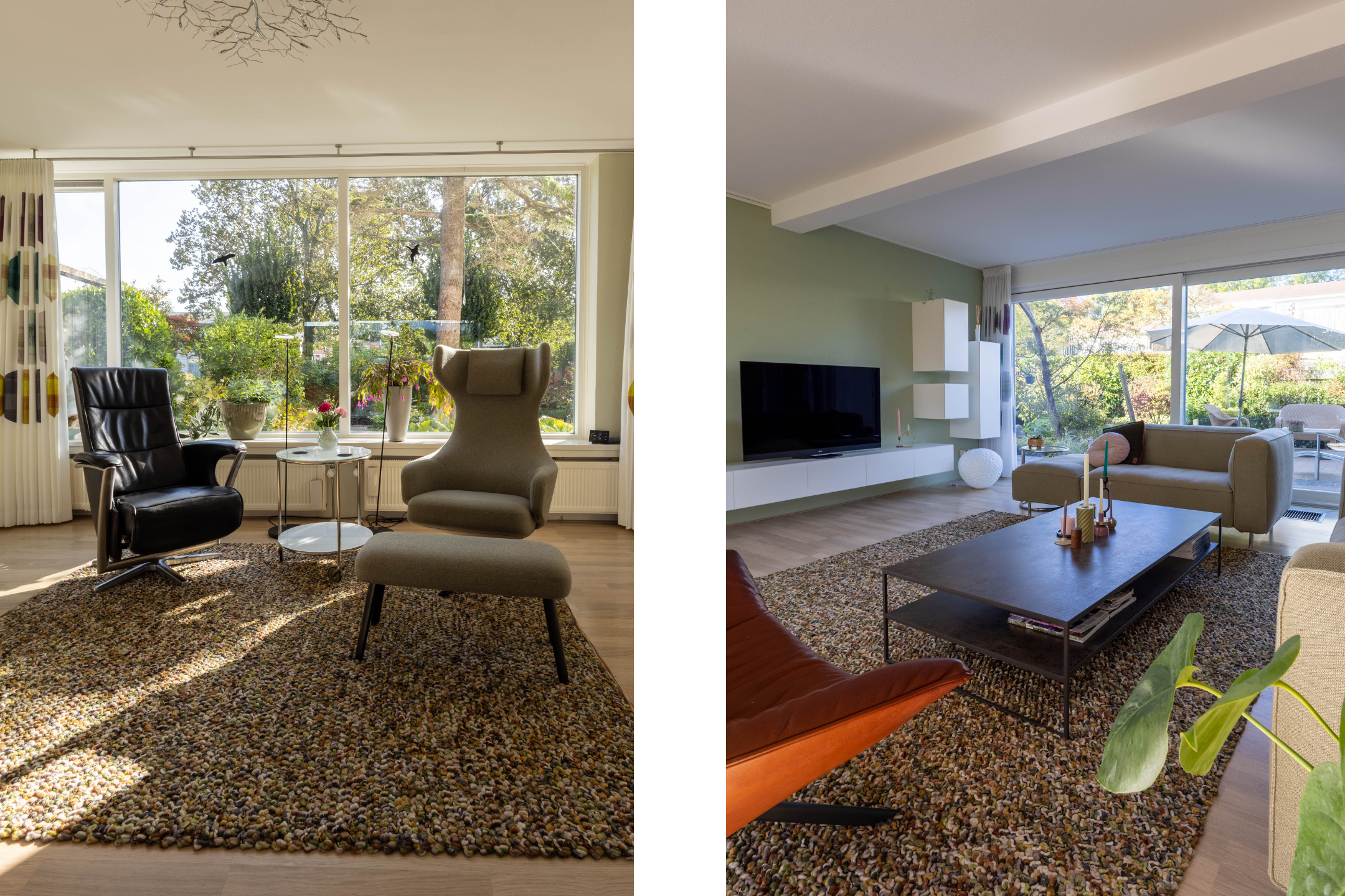 Hal/entree met meterkast, garderobekast en trapopgang naar de verdieping. Ruim toilet met wandcloset en fonteintje. Gesloten keuken met elektrische vloerverwarming en een fraaie hoekopstelling voorzien van diverse inbouwapparatuur, waaronder een 90 cm-inductiekookplaat, afzuigkap, oven, magnetron, vaatwasser en kokendwaterkraan. Aansluitend een ruime berging/bijkeuken met achterentree en aansluitingen voor de witgoedopstelling. De L-vormige woonkamer meet circa 60 m², met volop ruimte voor een royale eettafel en zithoek. Grote raampartijen aan de voorzijde en een brede kunststof schuifpui aan de achterzijde zorgen voor veel lichtinval. In de koudere maanden kunt u hier genieten van de warmte van de sfeervolle houtkachel. Vanuit de hal is er toegang tot de achtertuin en een slaapkamer met badkamer, voorzien van een inloopdouche, tweede toilet en wastafel.
