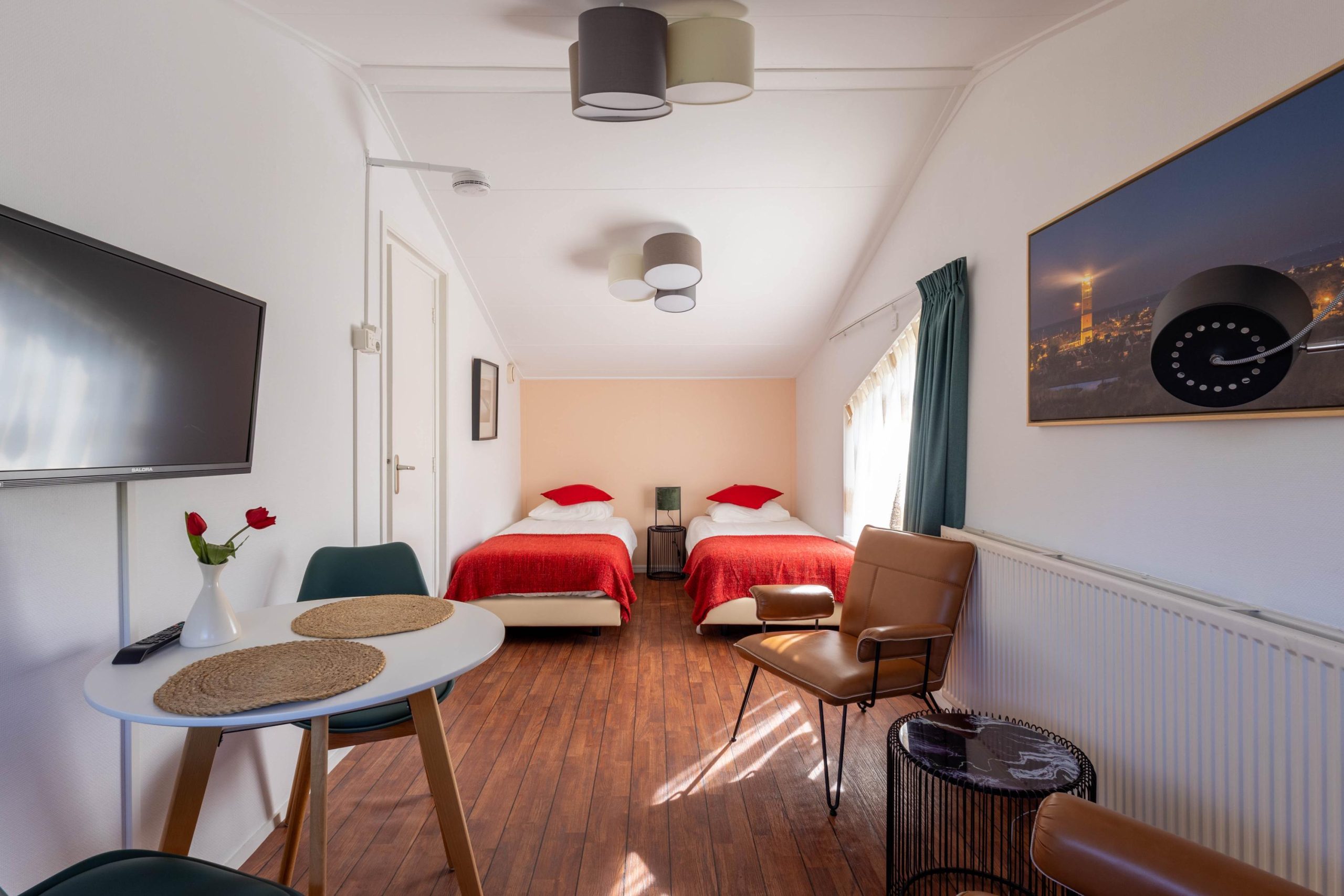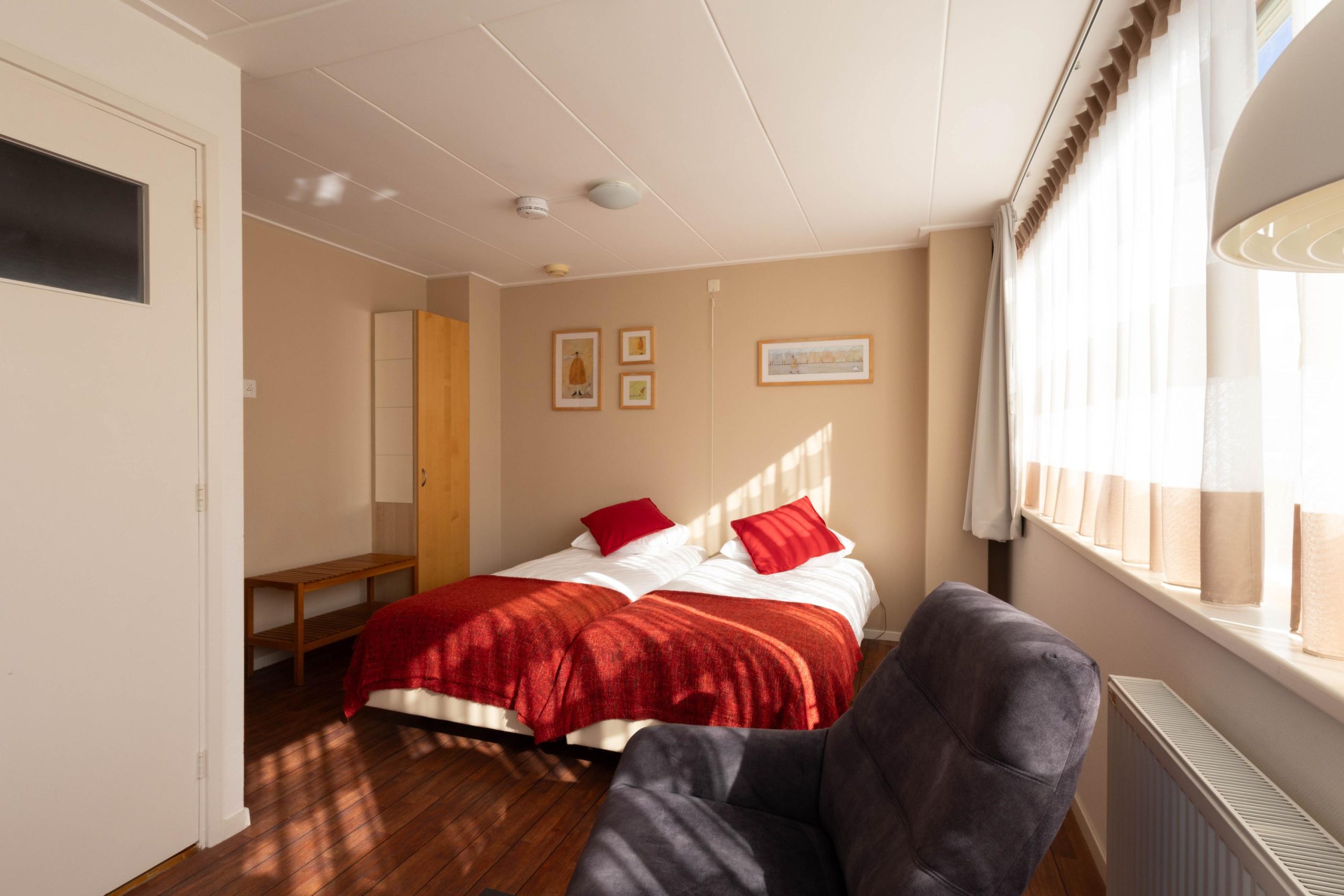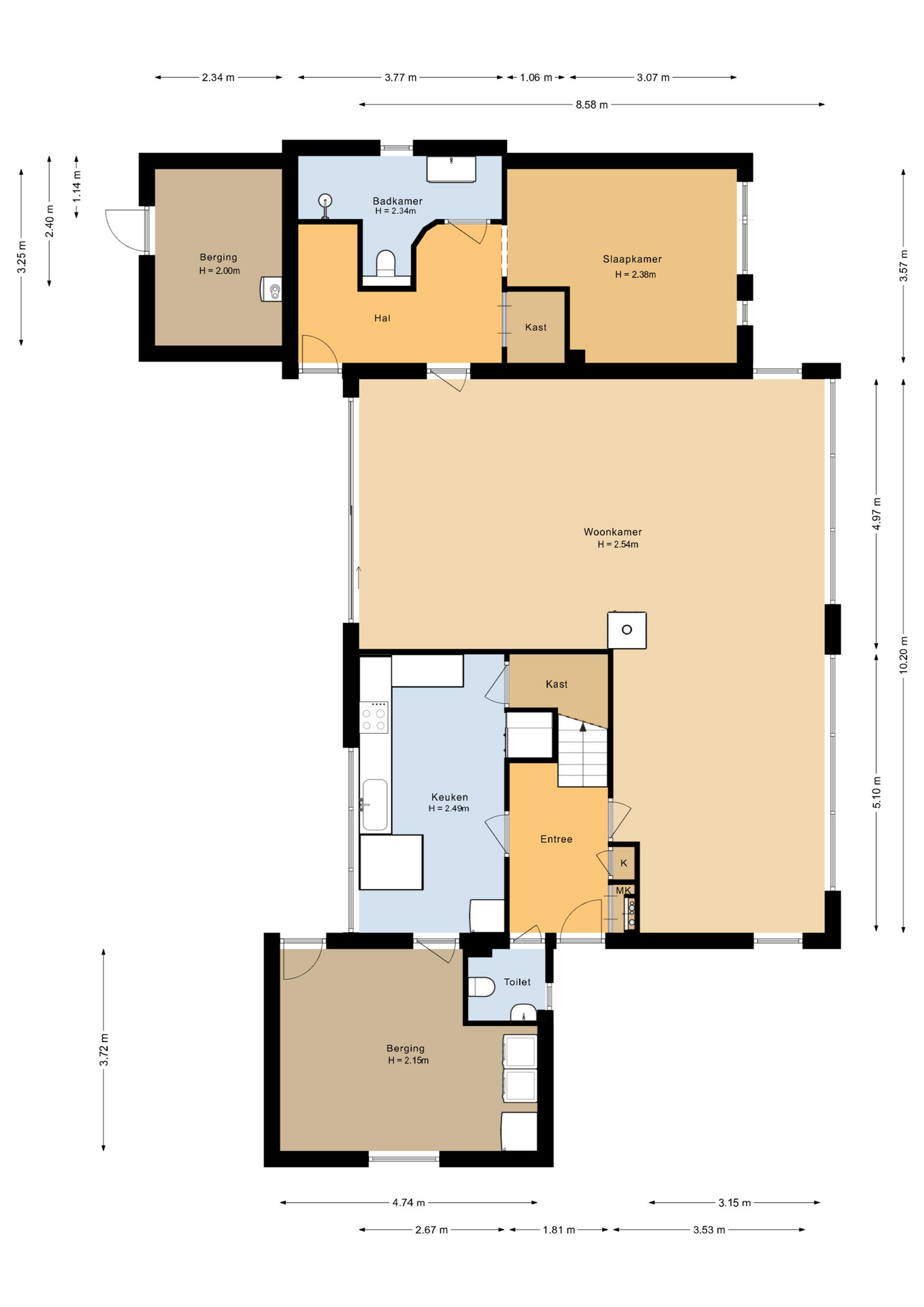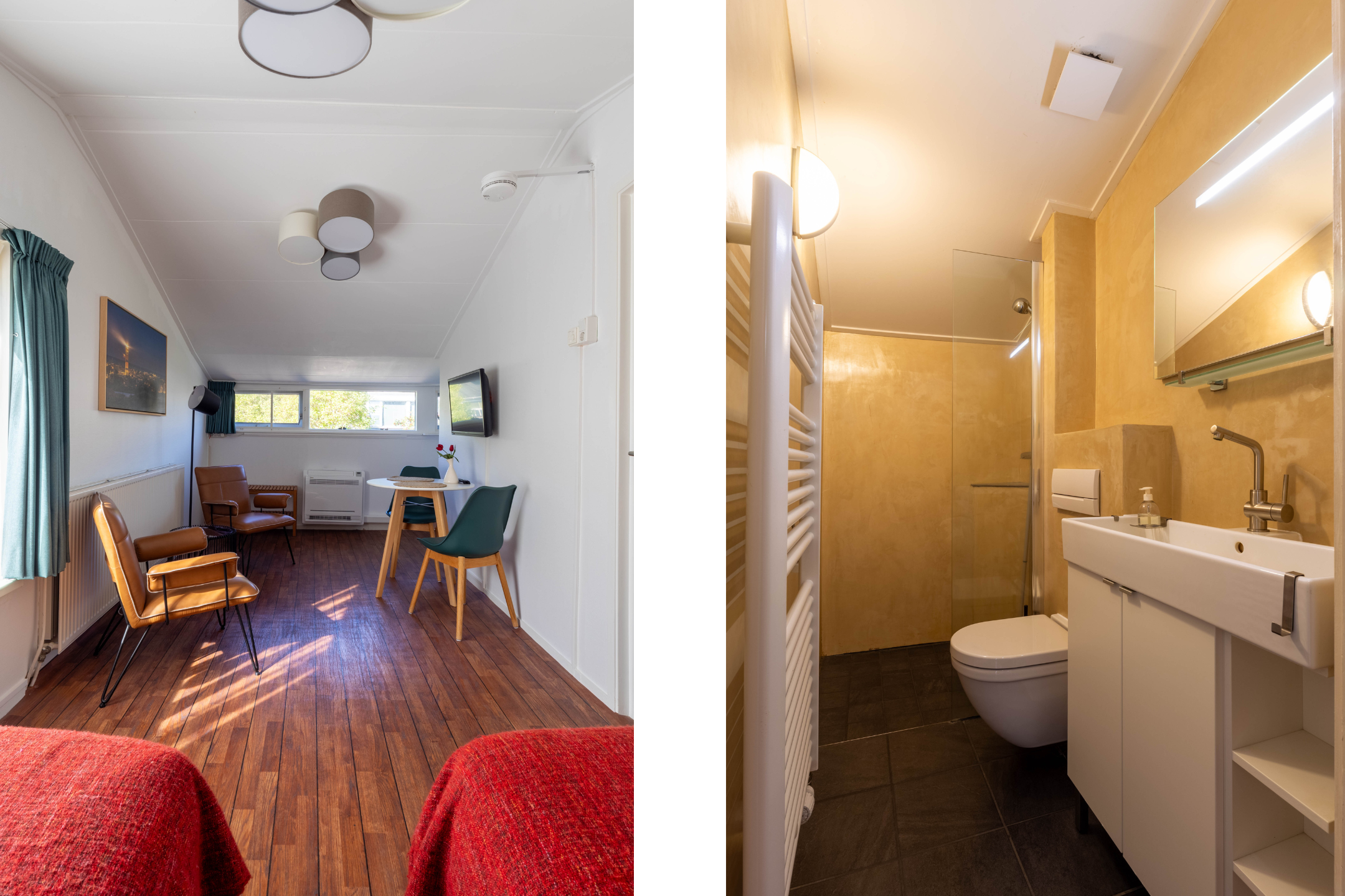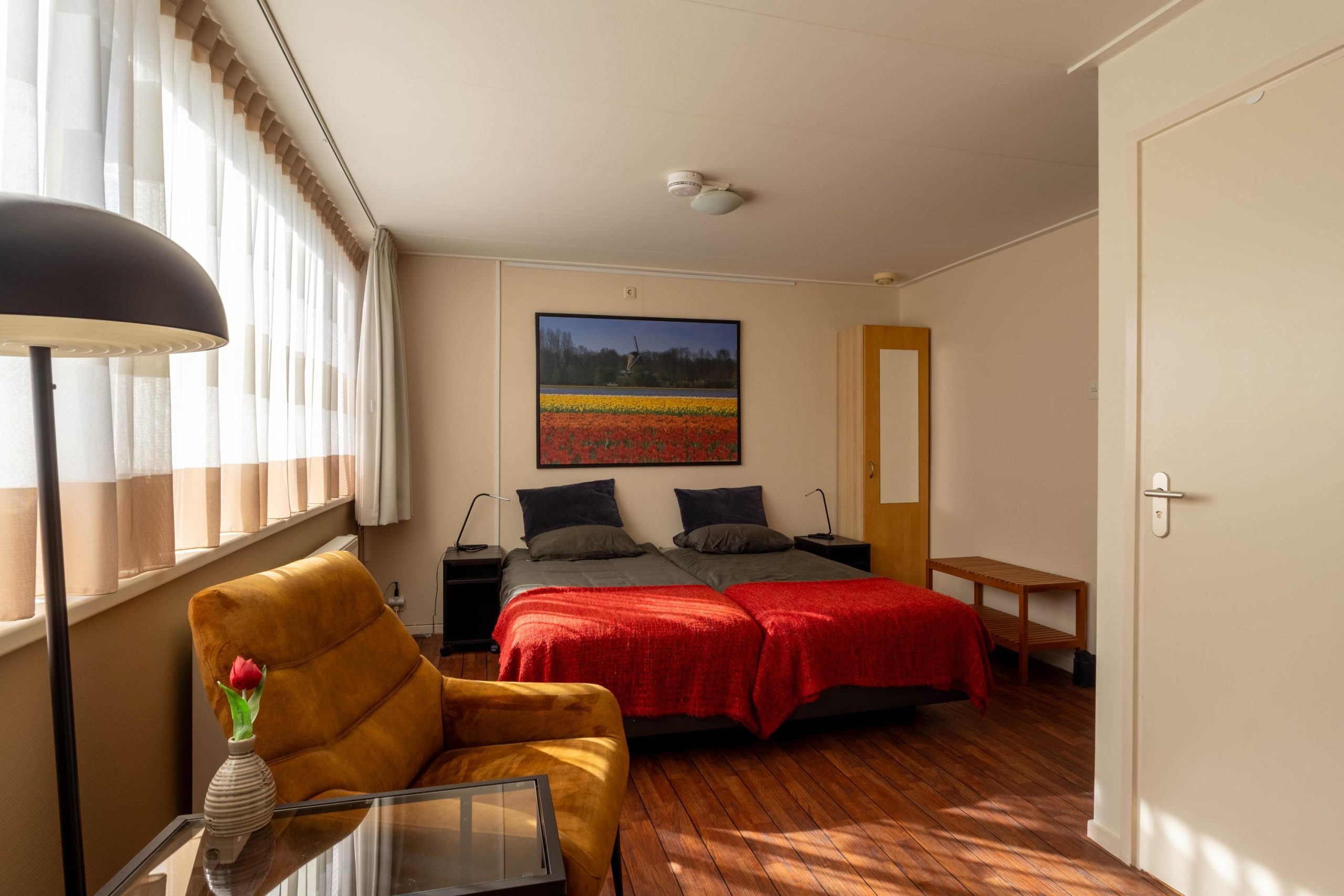 Hal/entree met meterkast, garderobekast en trapopgang naar de verdieping. Ruim toilet met wandcloset en fonteintje. Gesloten keuken met elektrische vloerverwarming en een fraaie hoekopstelling voorzien van diverse inbouwapparatuur, waaronder een 90 cm-inductiekookplaat, afzuigkap, oven, magnetron, vaatwasser en kokendwaterkraan. Aansluitend een ruime berging/bijkeuken met achterentree en aansluitingen voor de witgoedopstelling. De L-vormige woonkamer meet circa 60 m², met volop ruimte voor een royale eettafel en zithoek. Grote raampartijen aan de voorzijde en een brede kunststof schuifpui aan de achterzijde zorgen voor veel lichtinval. In de koudere maanden kunt u hier genieten van de warmte van de sfeervolle houtkachel. Vanuit de hal is er toegang tot de achtertuin en een slaapkamer met badkamer, voorzien van een inloopdouche, tweede toilet en wastafel.