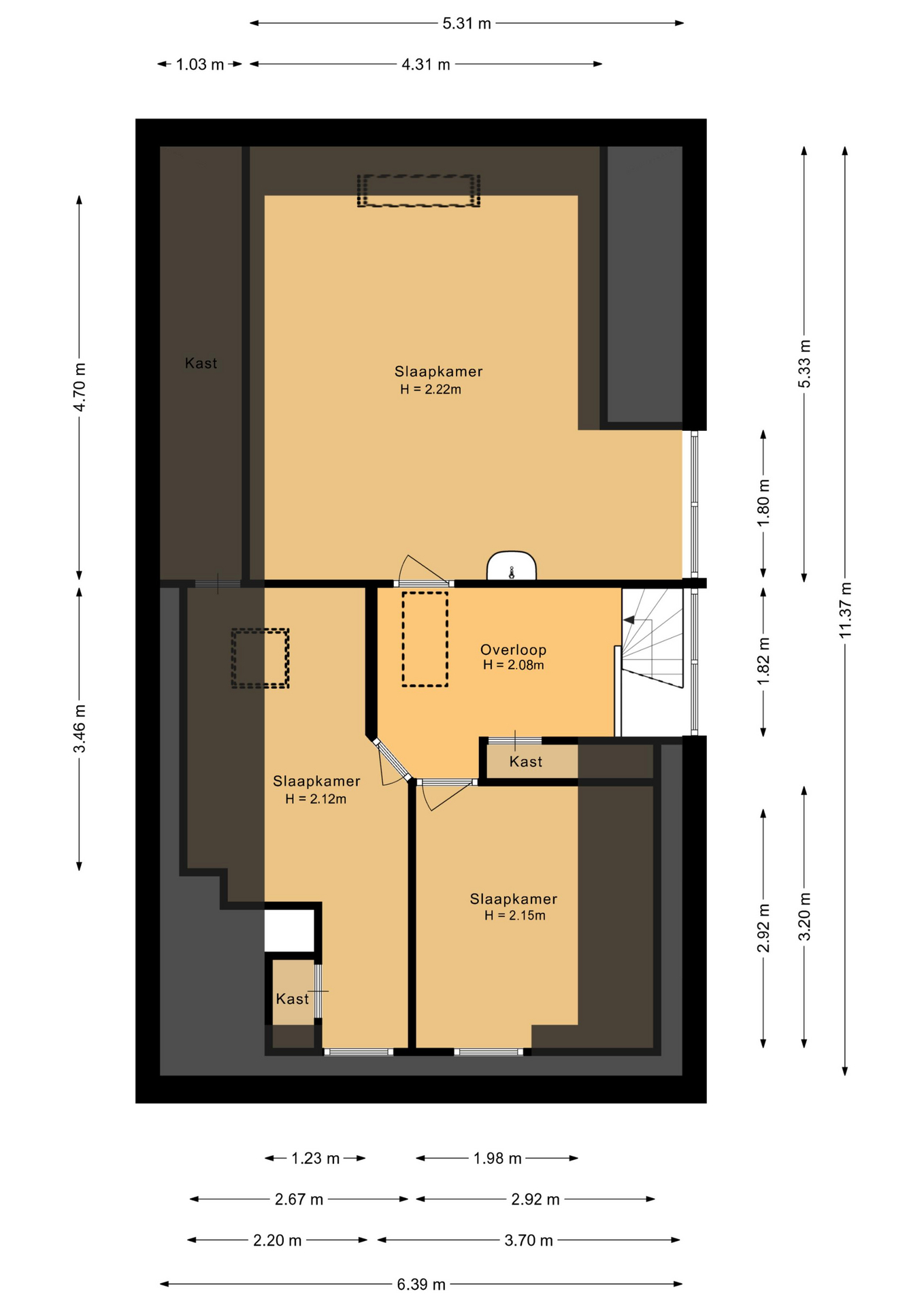 Verdieping: Overloop met vaste kast en luik naar de vliering. Slaapkamer I, slaapkamer II en slaapkamer III (ouderkamer) met wastafel. De verdieping biedt een praktische indeling, met mogelijkheden om ruimtes samen te voegen of anders in te delen indien gewenst.