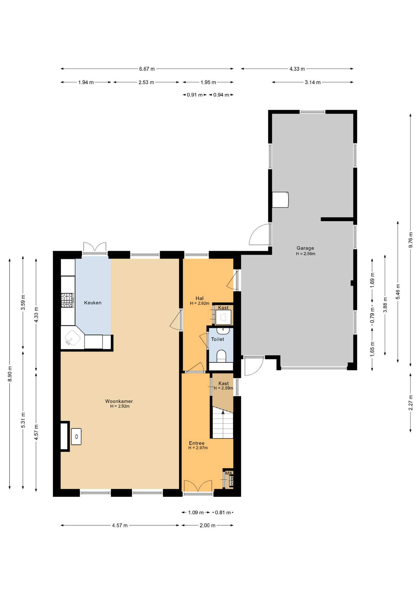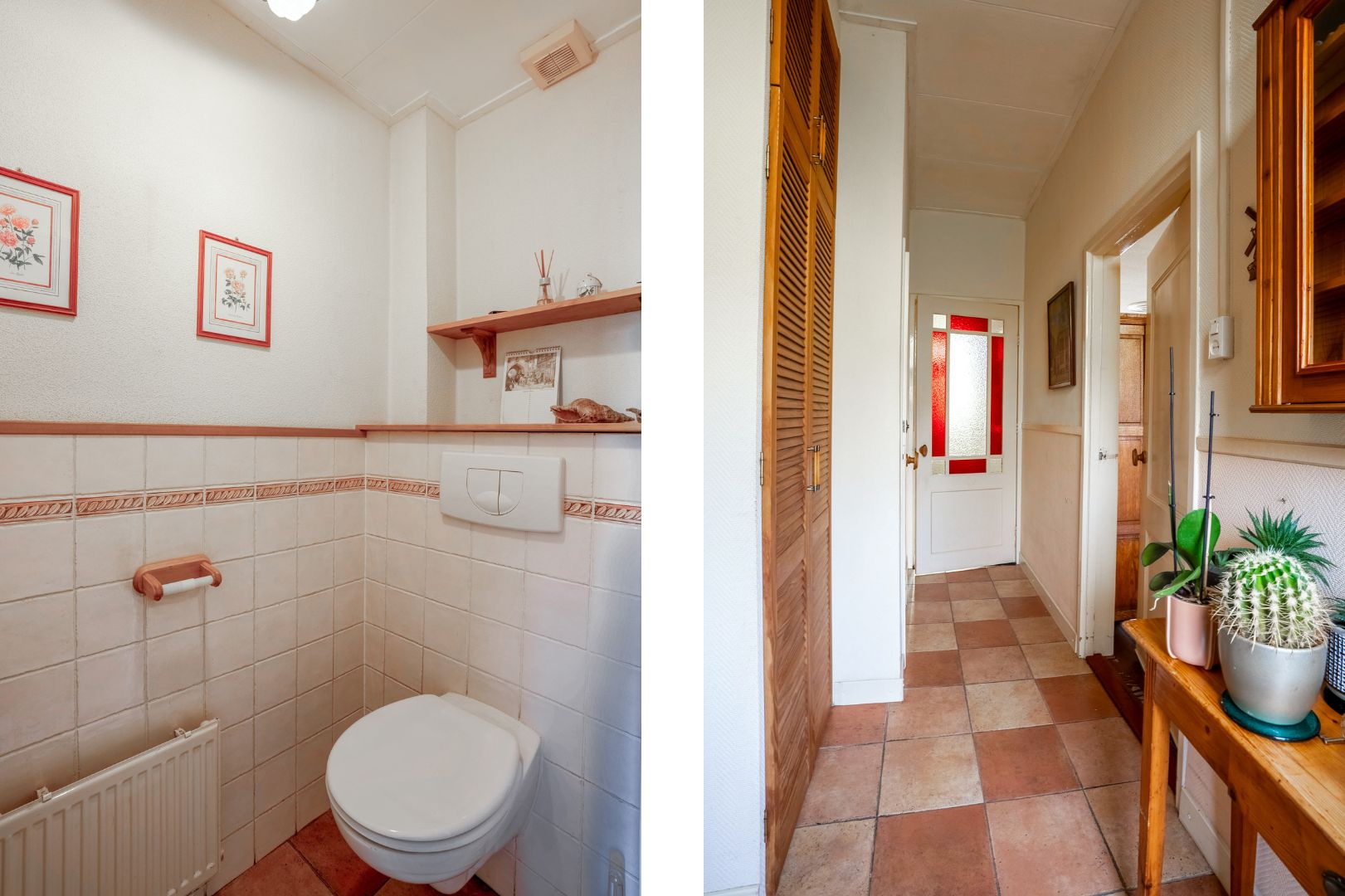 Terug in de hal vind je het toilet en een vaste (was)kast met de aansluiting voor het witgoed. Vanuit dezelfde hal is ook de aangebouwde garage bereikbaar, met ruimte voor een kleine werkplaats. Vanuit de garage is er eveneens een deur naar de achtertuin.