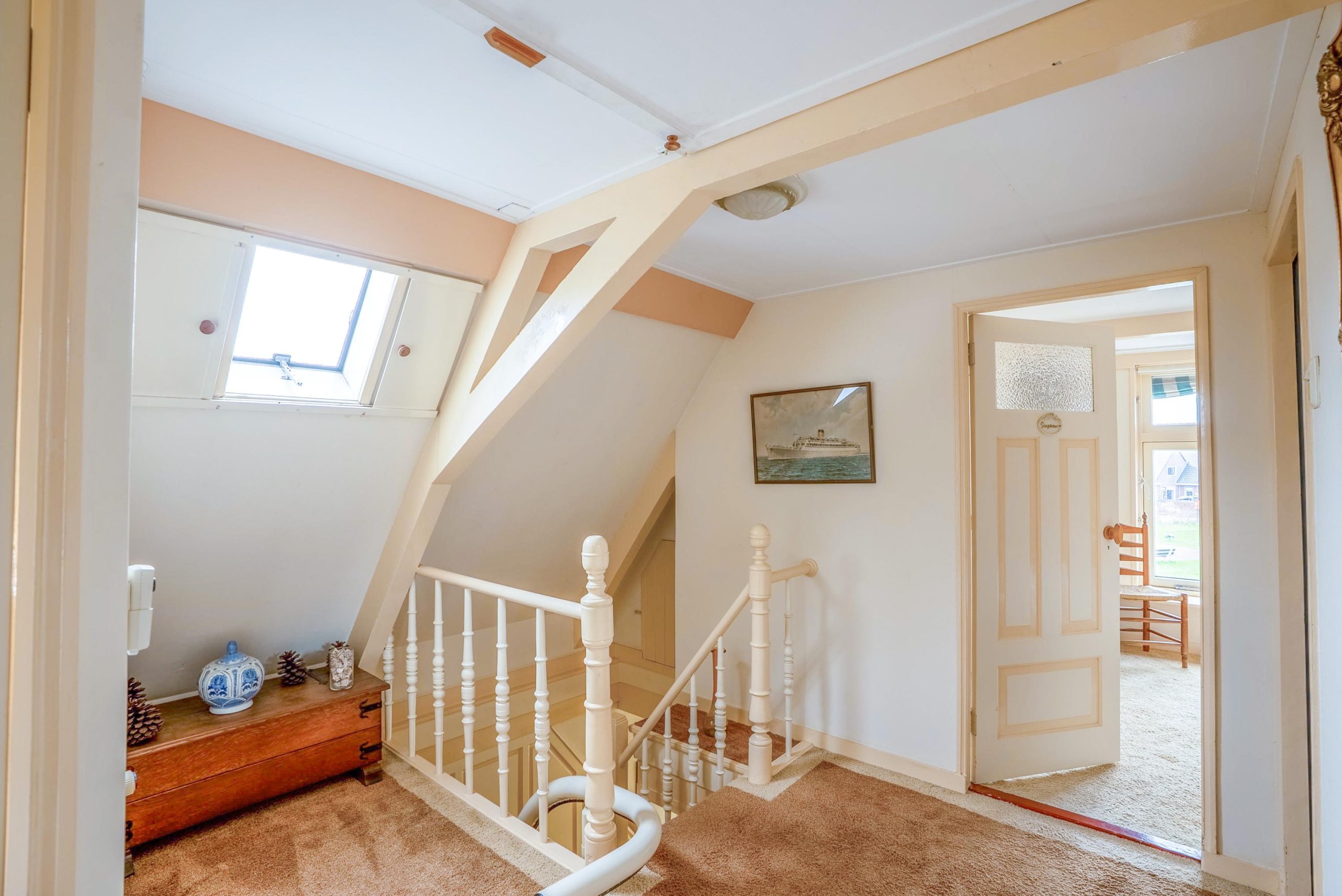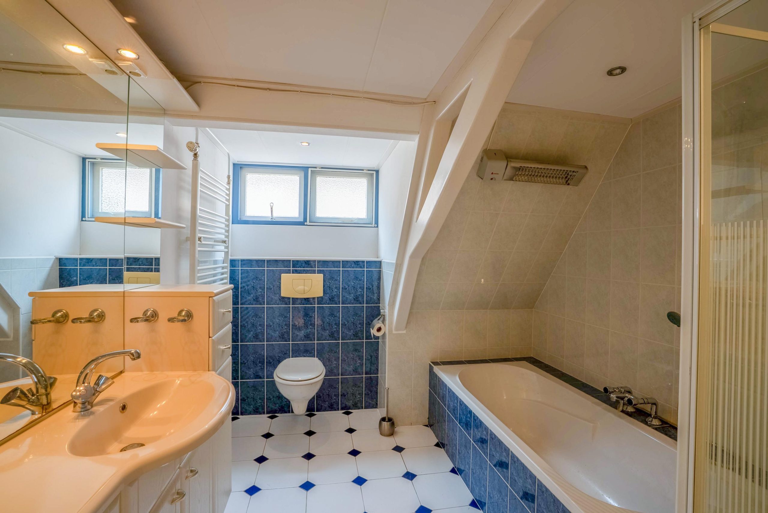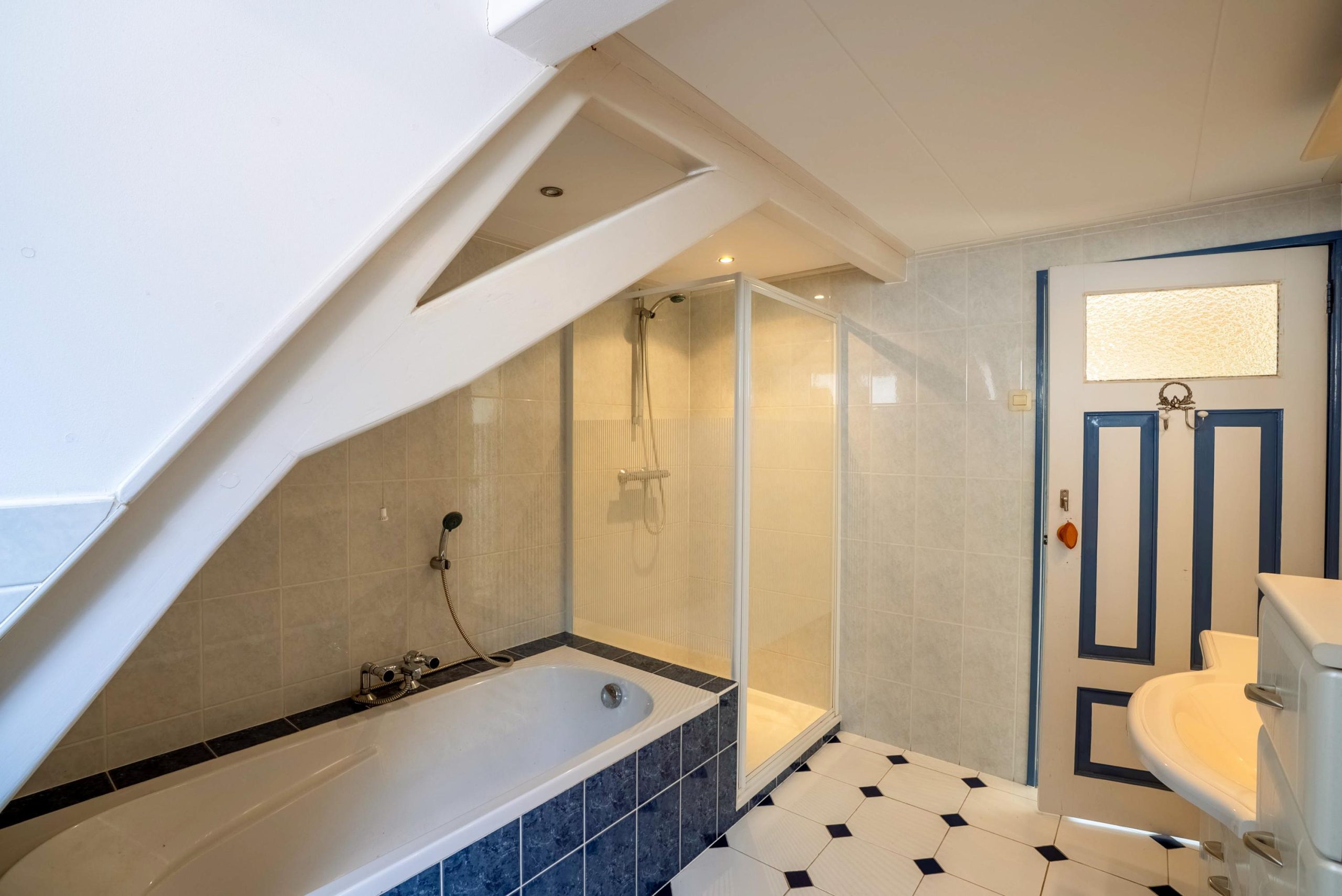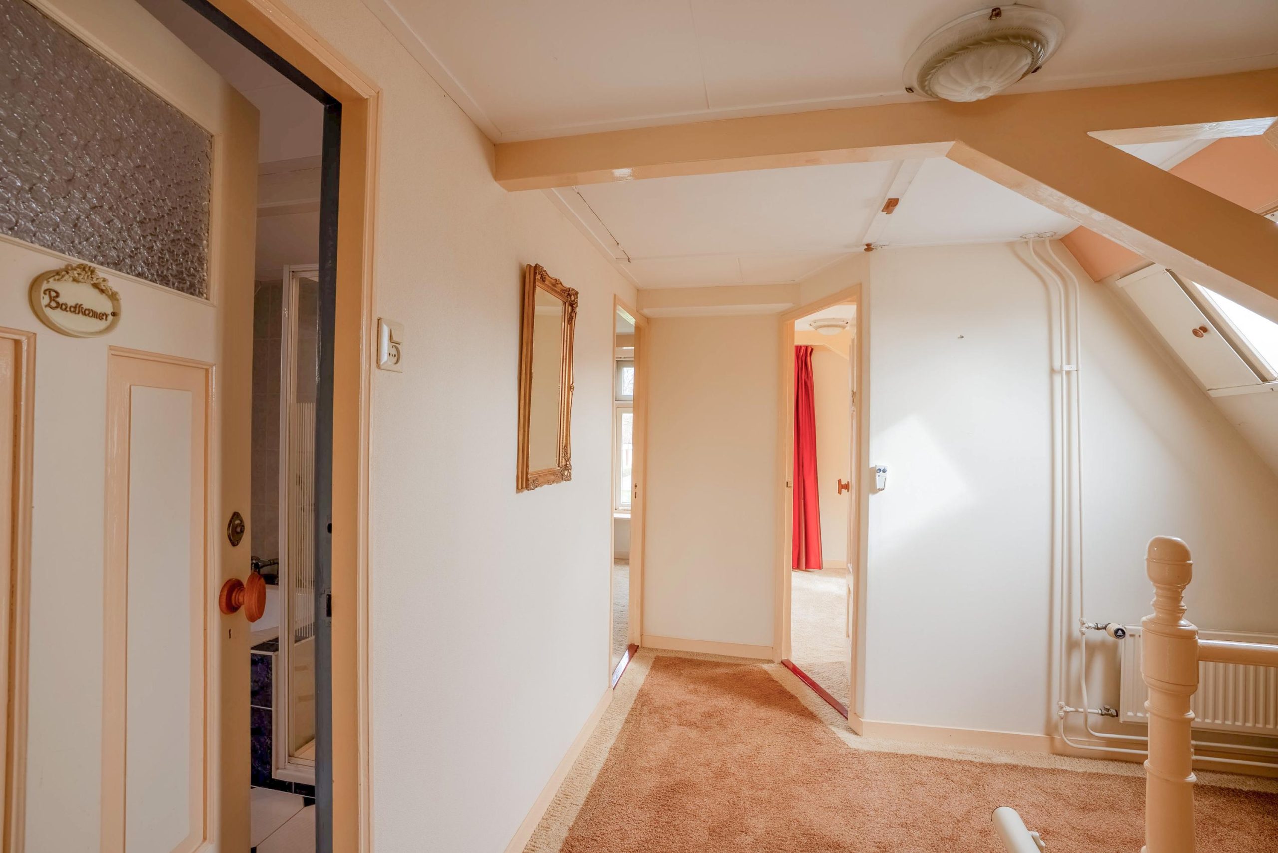 Op de eerste verdieping zijn drie slaapkamers en een badkamer. De badkamer is compleet uitgerust met een ligbad, douche, wastafel en tweede toilet. Via de overloop is met een vlizotrap de zolder bereikbaar, waar zich ook de cv-opstelling bevindt.