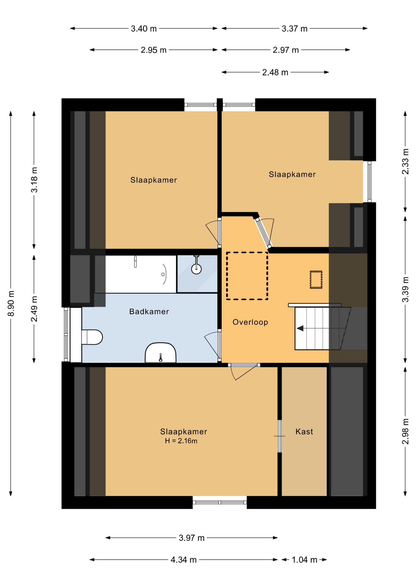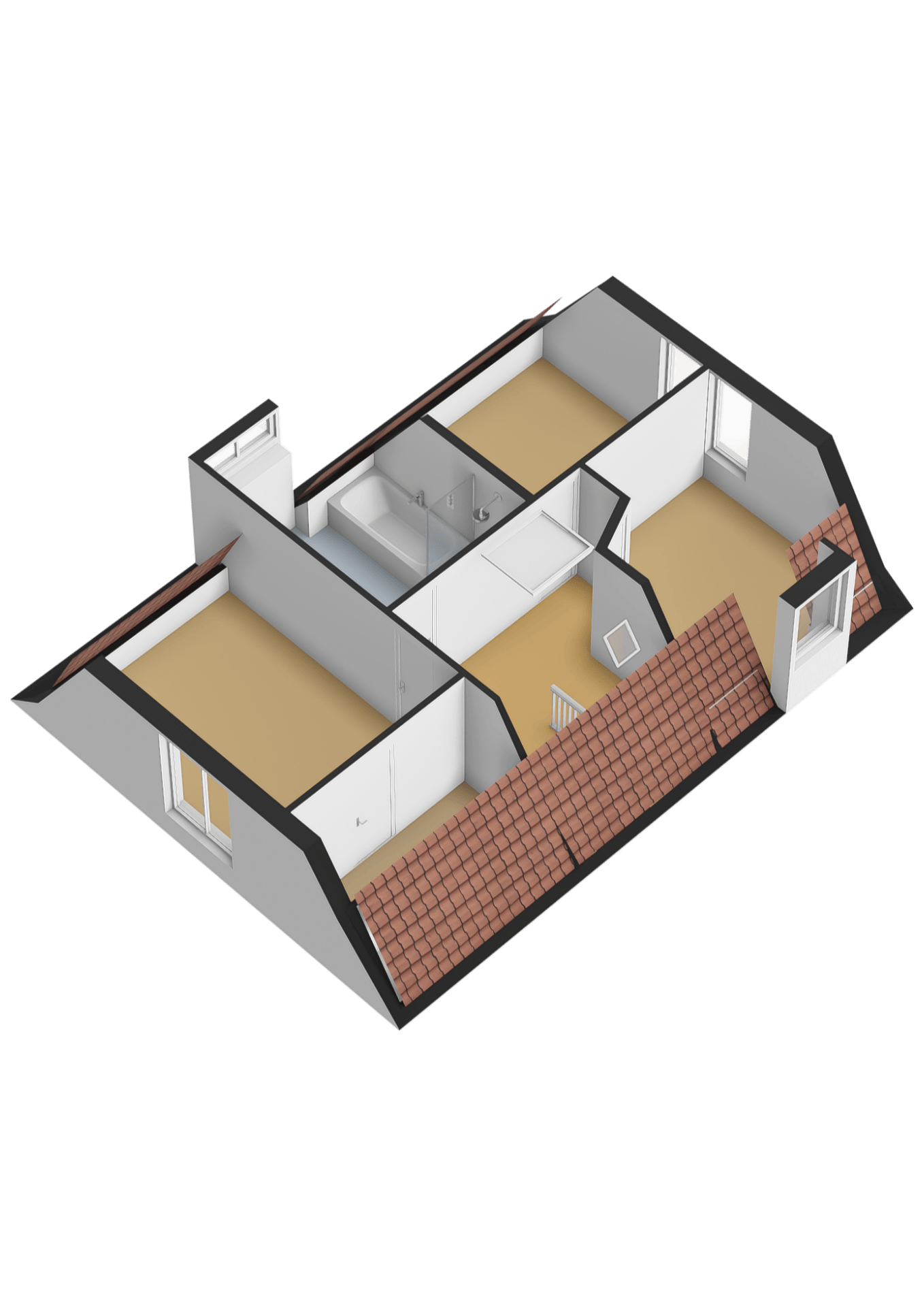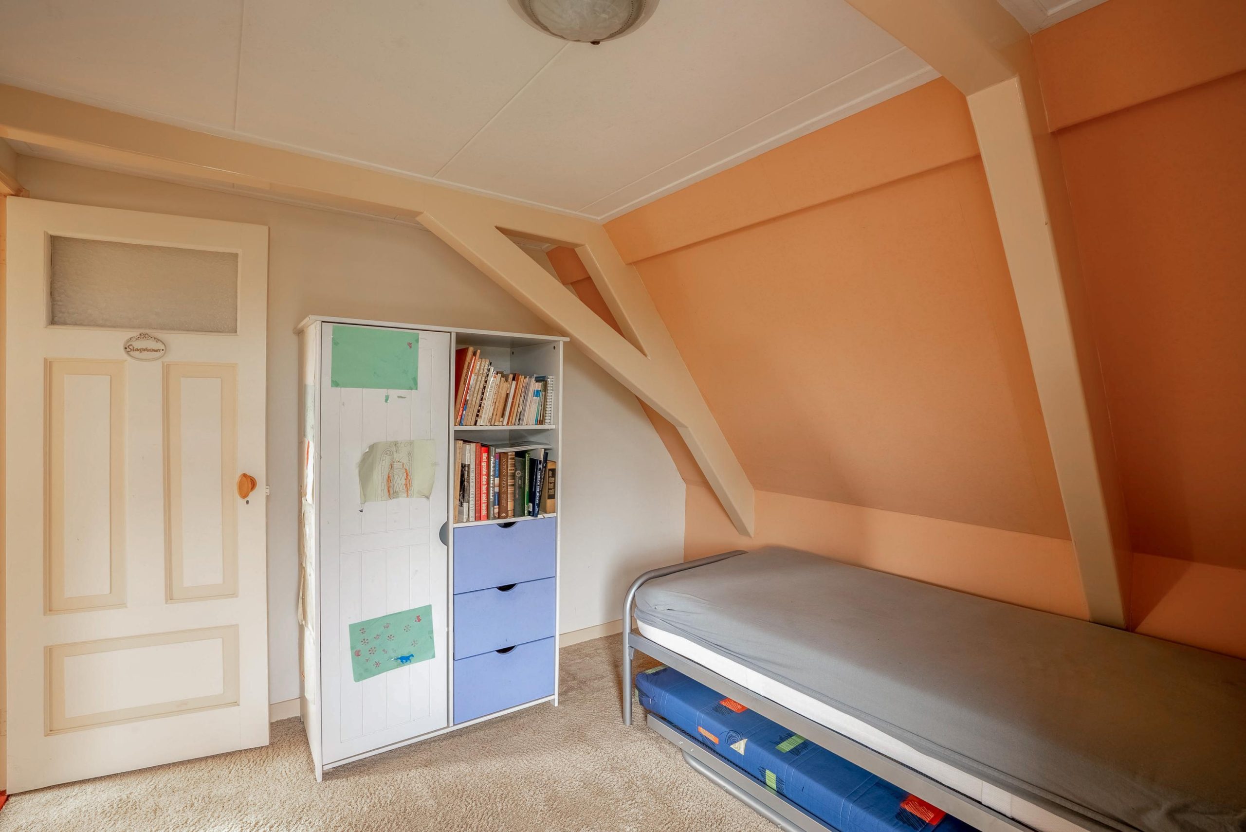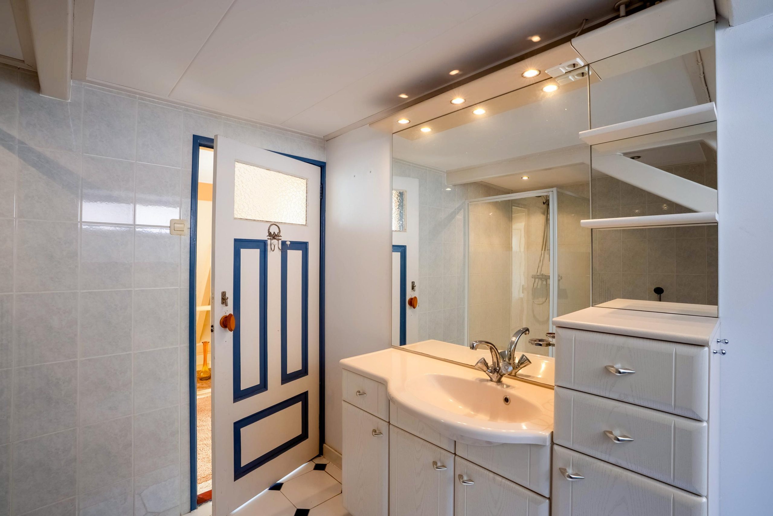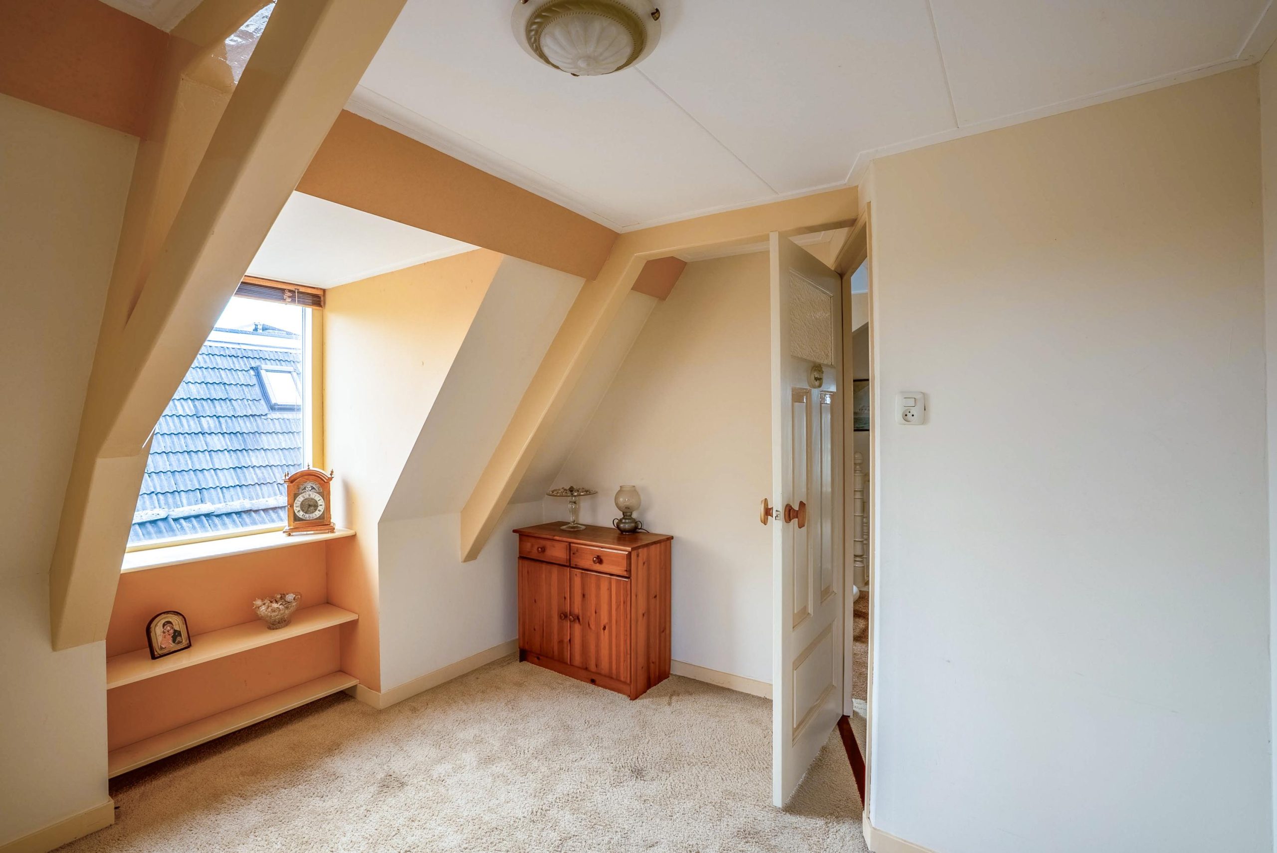 Op de eerste verdieping zijn drie slaapkamers en een badkamer. De badkamer is compleet uitgerust met een ligbad, douche, wastafel en tweede toilet. Via de overloop is met een vlizotrap de zolder bereikbaar, waar zich ook de cv-opstelling bevindt.