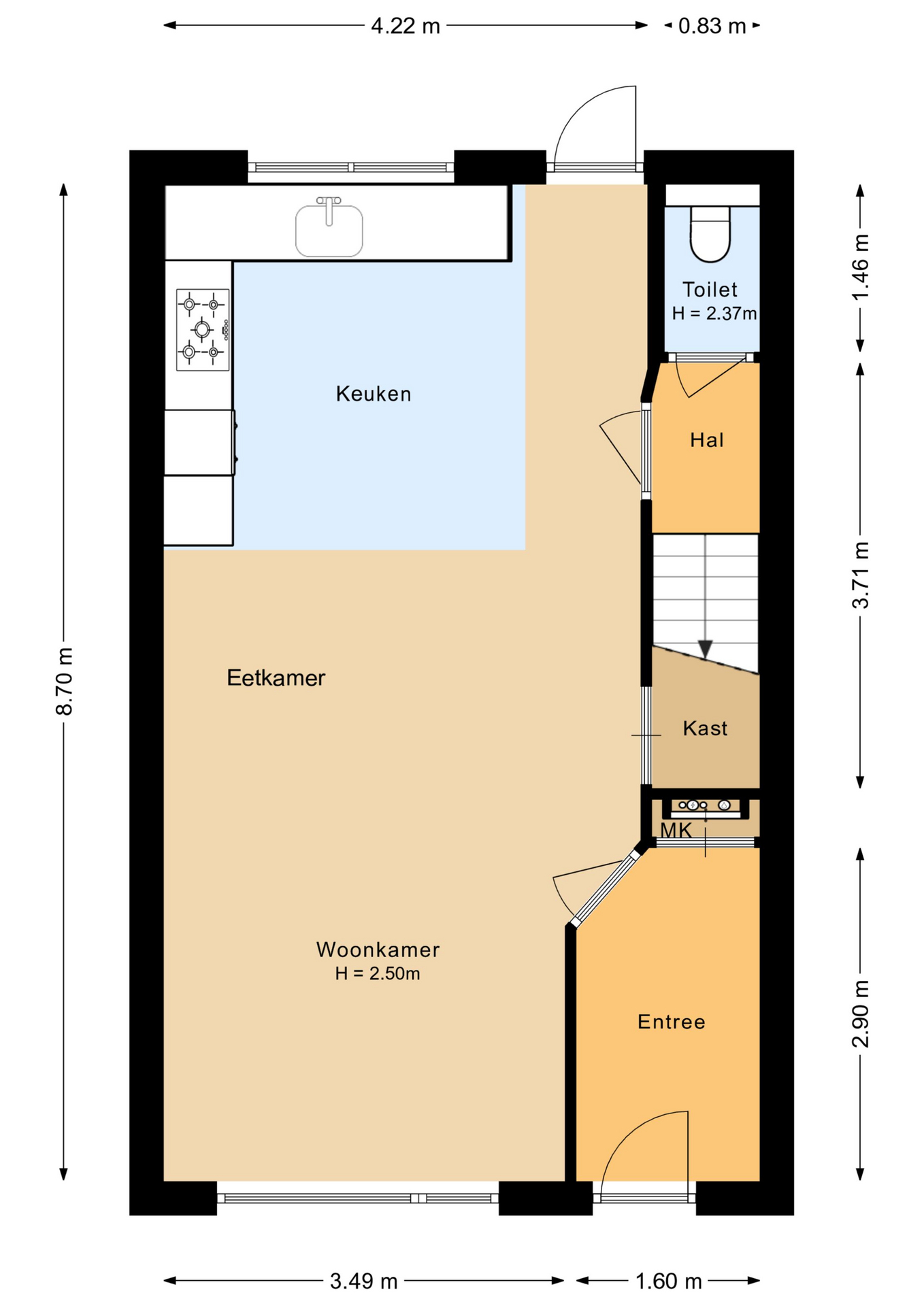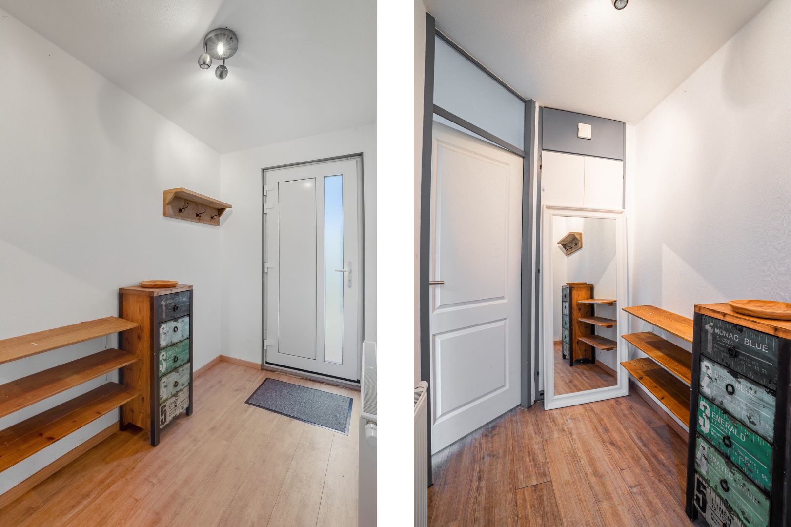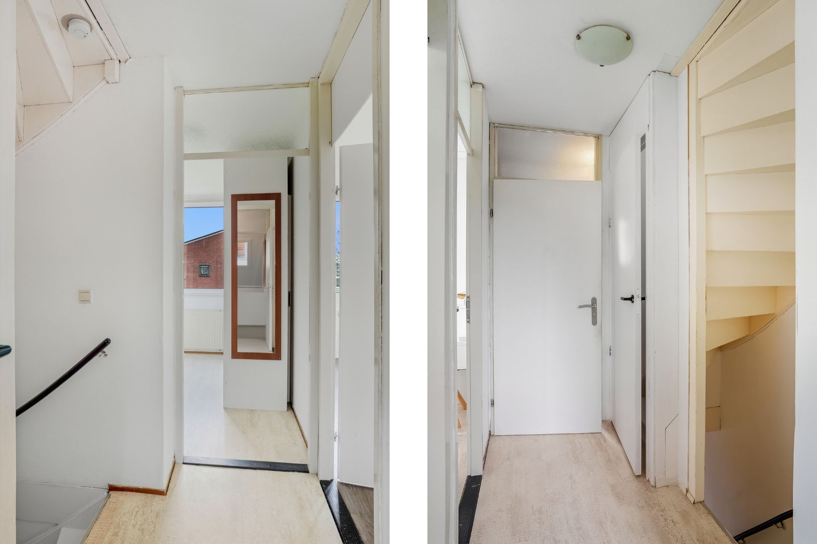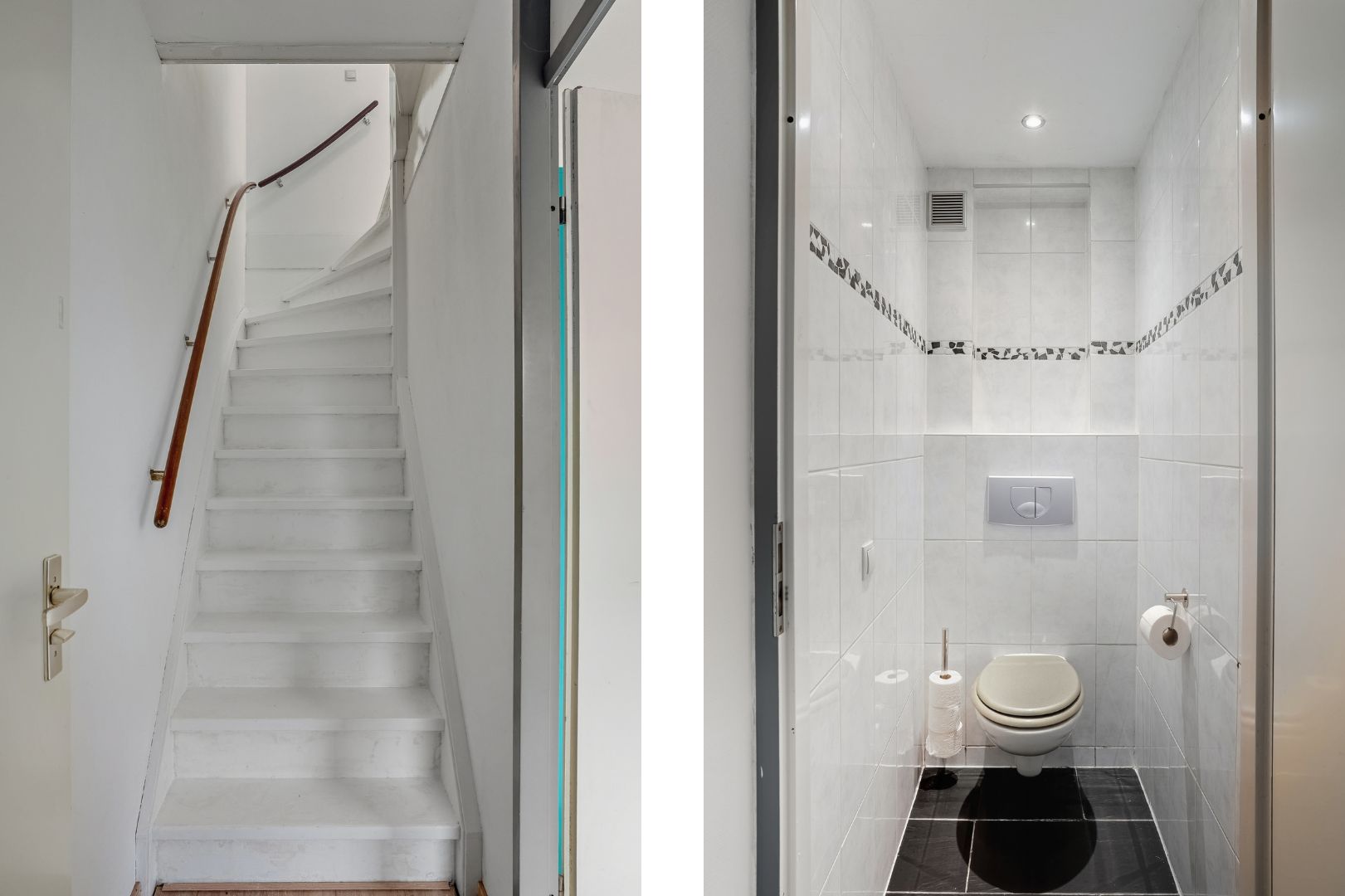 Achter de woonkamer bevindt zich een tussenhal met toegang tot het toilet en de trap naar de eerste verdieping. Onder de trap is een praktische trapkast aanwezig.