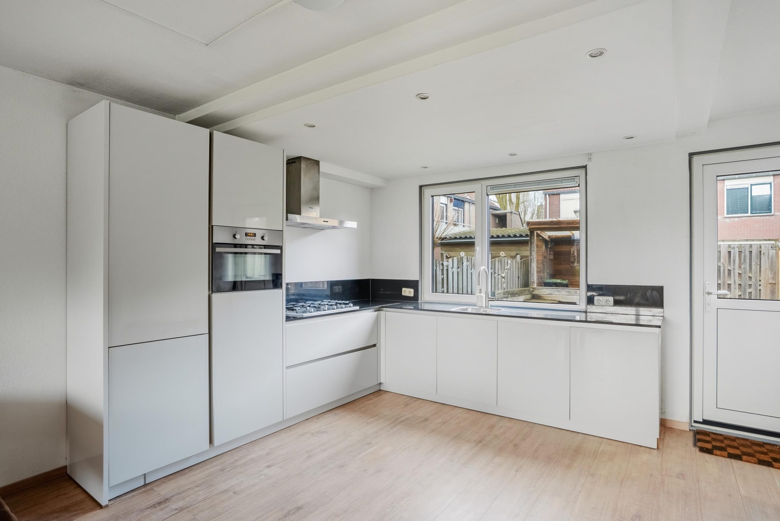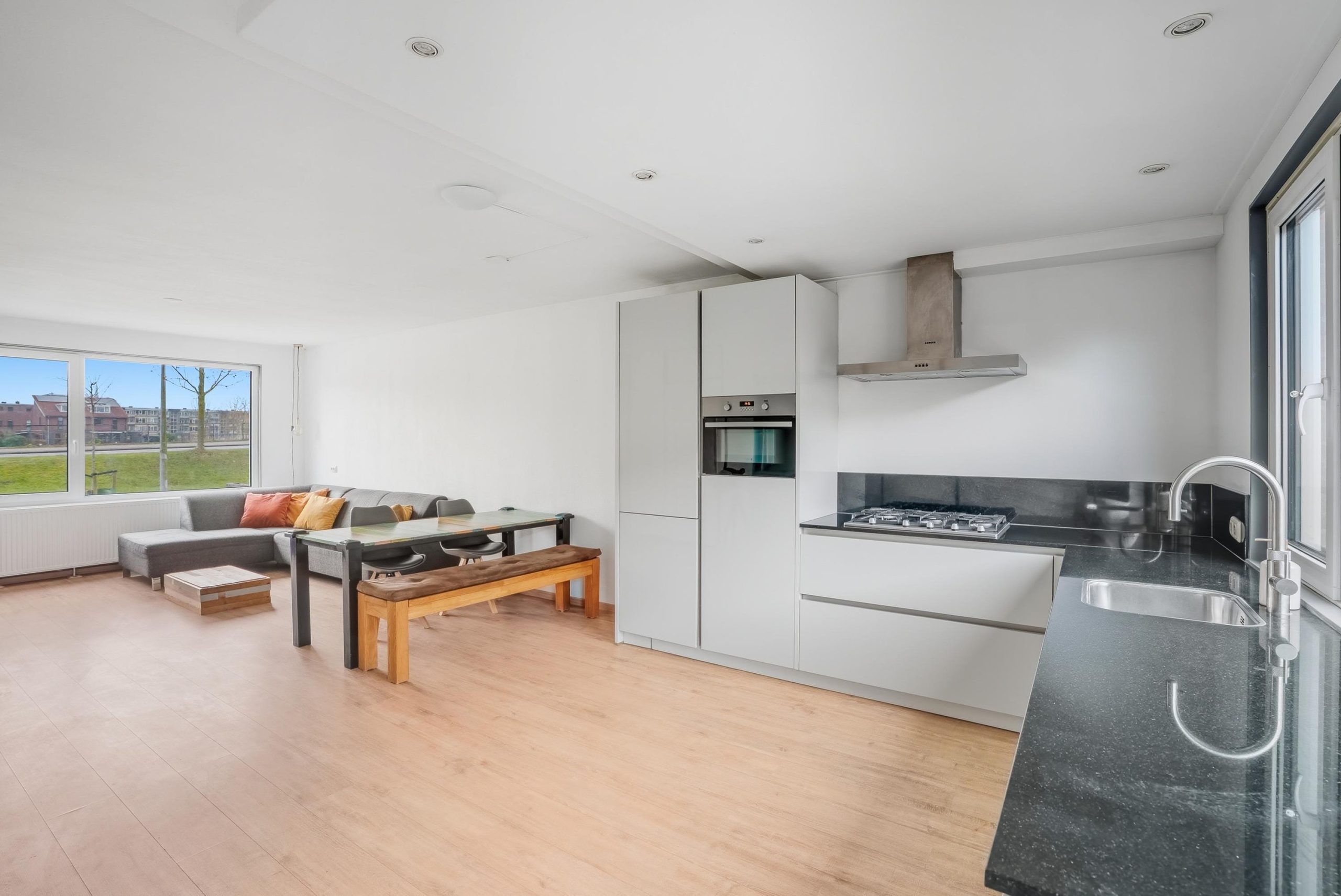 Via de voordeur kom je binnen in de entree met meterkast en doorgang naar de woonkamer. De woonkamer is een lichte doorzonruimte met een open keuken aan de achterzijde. De moderne keuken is uitgevoerd in een hoekopstelling en voorzien van diverse inbouwapparatuur, waaronder een vijfpits gasfornuis met afzuigkap, een vaatwasser, een combi-oven/magnetron en een koel-vriescombinatie. Vanuit de keuken is er directe toegang tot de achtertuin.
