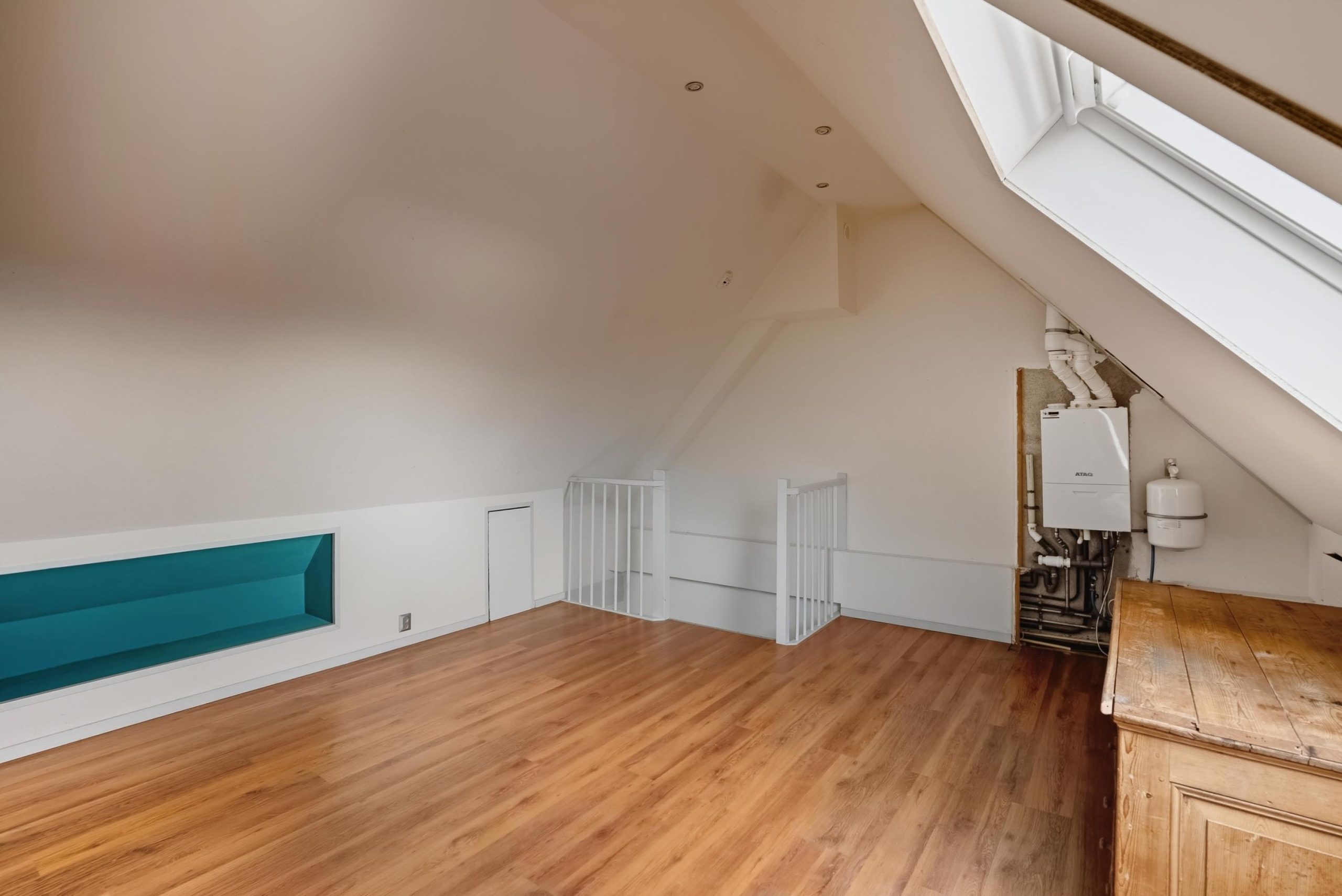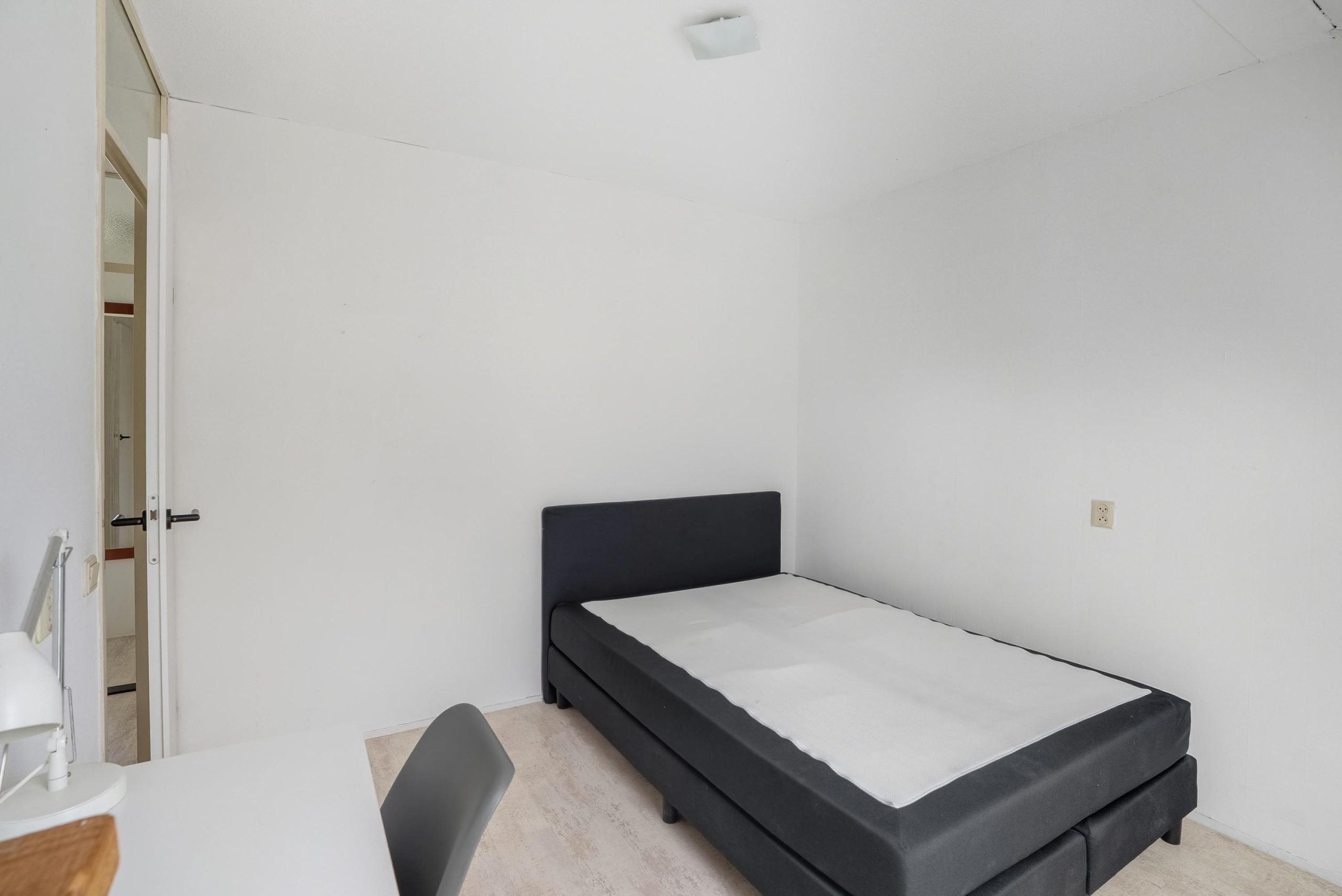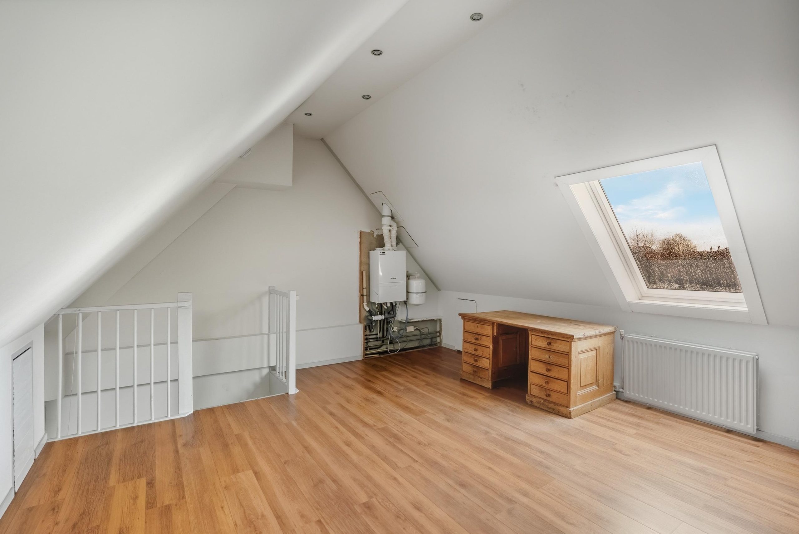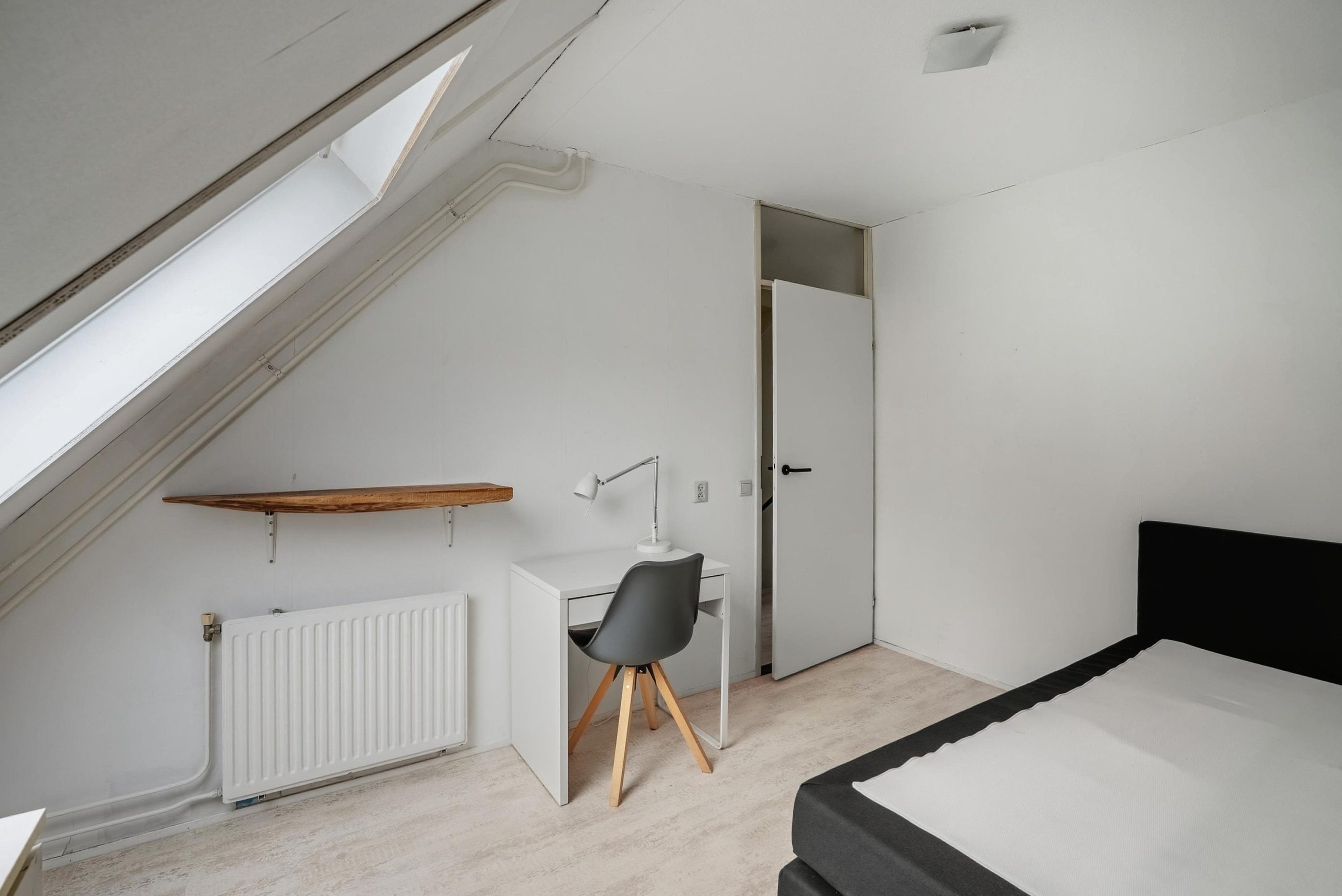 Via een vaste trap bereik je de tweede verdieping. Deze verdieping is momenteel ingericht als één ruime slaapkamer. Hier bevindt zich ook de cv-opstelling. De ruimte biedt mogelijkheden om verder in te delen, bijvoorbeeld voor een extra werkplek of bergruimte. Ook hier kan eventueel witgoed worden geplaatst.