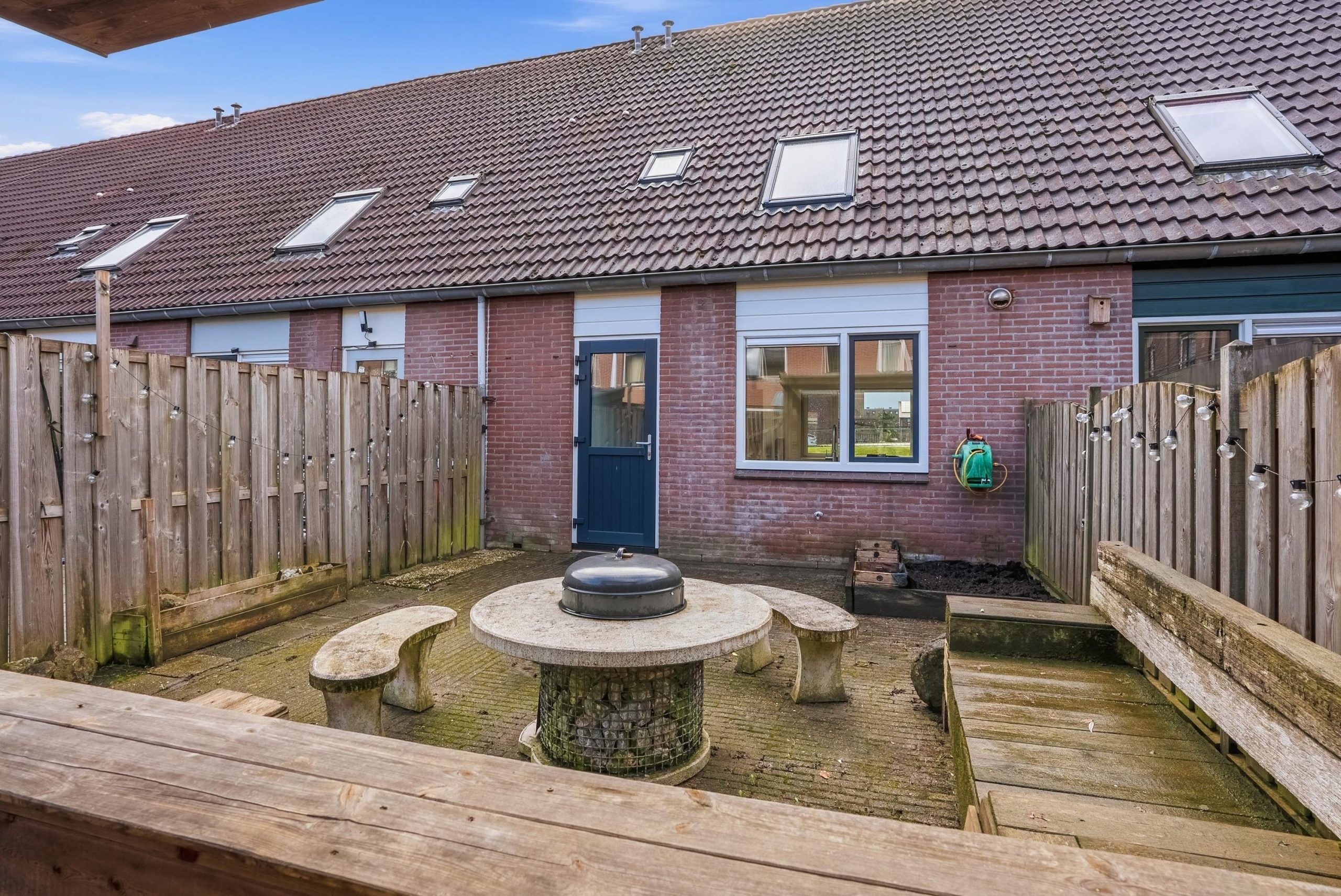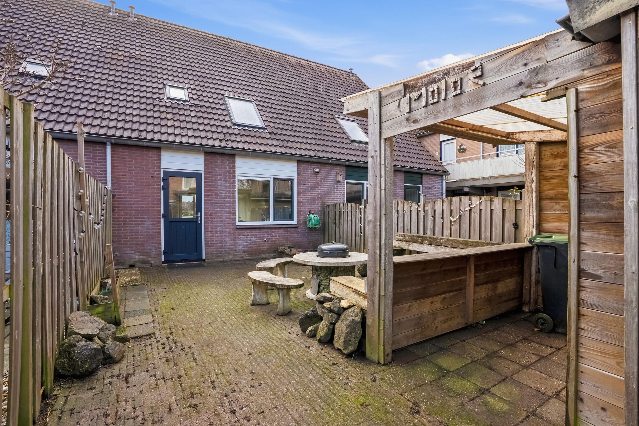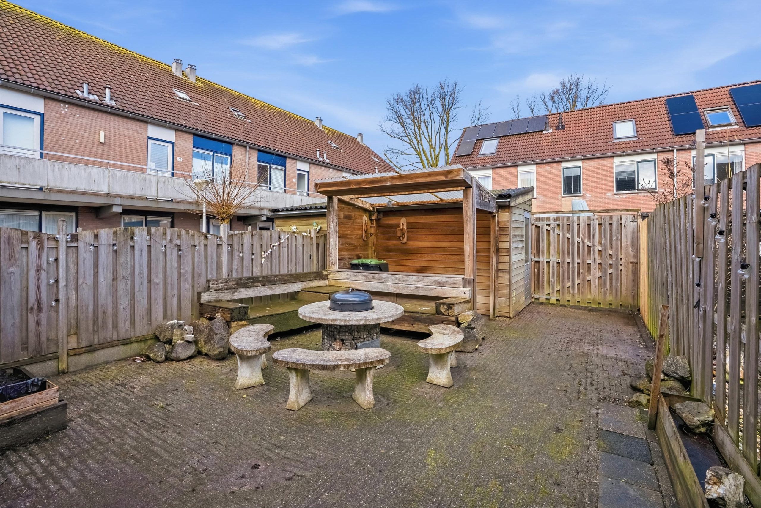 De achtertuin ligt op het noorden en beschikt over een achterom via een gezamenlijke steeg. Achter in de tuin staat een houten berging met een overkapping — handig voor fietsen, opslag of een beschutte zitplek. Parkeren kan openbaar op korte afstand van de woning.