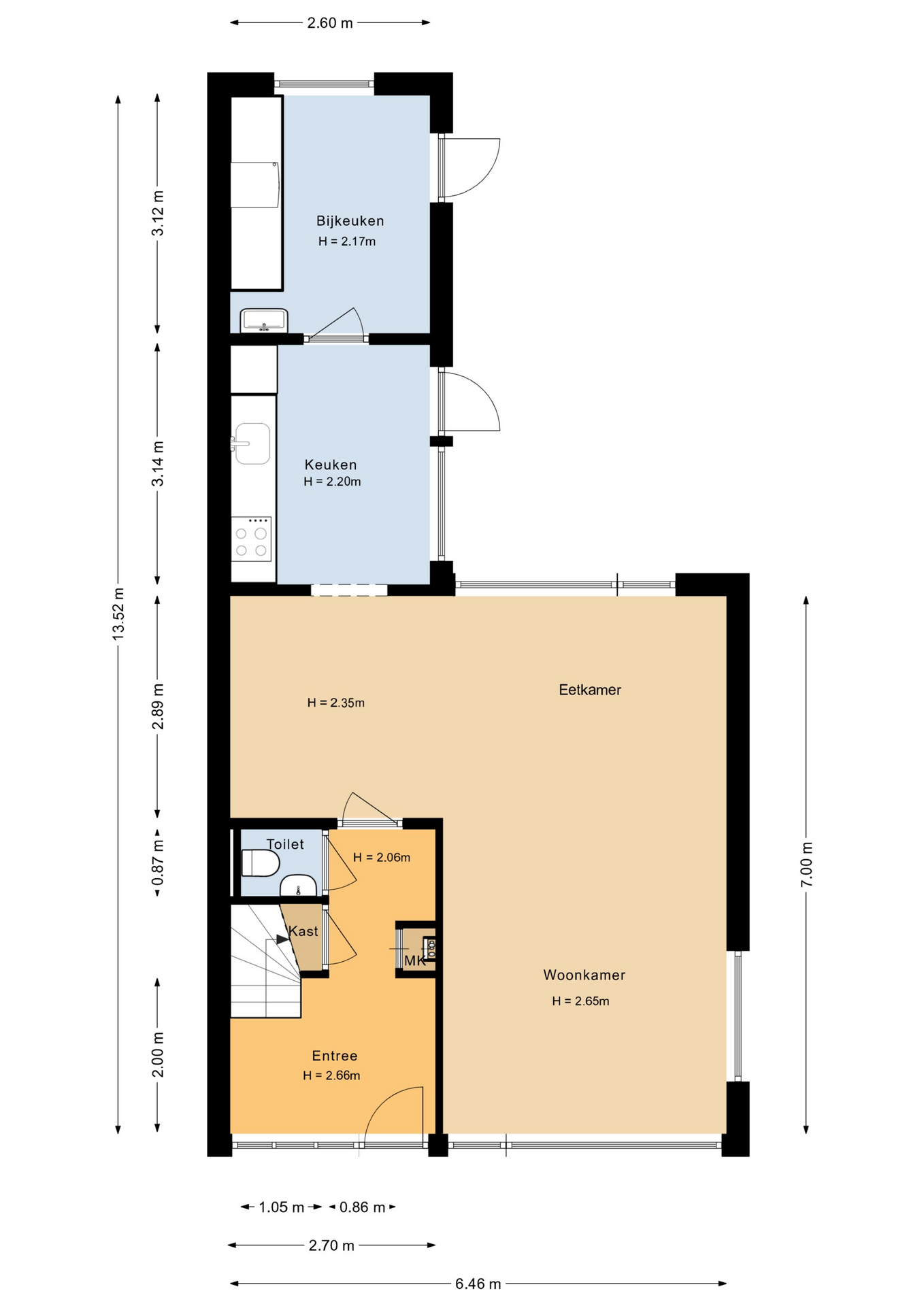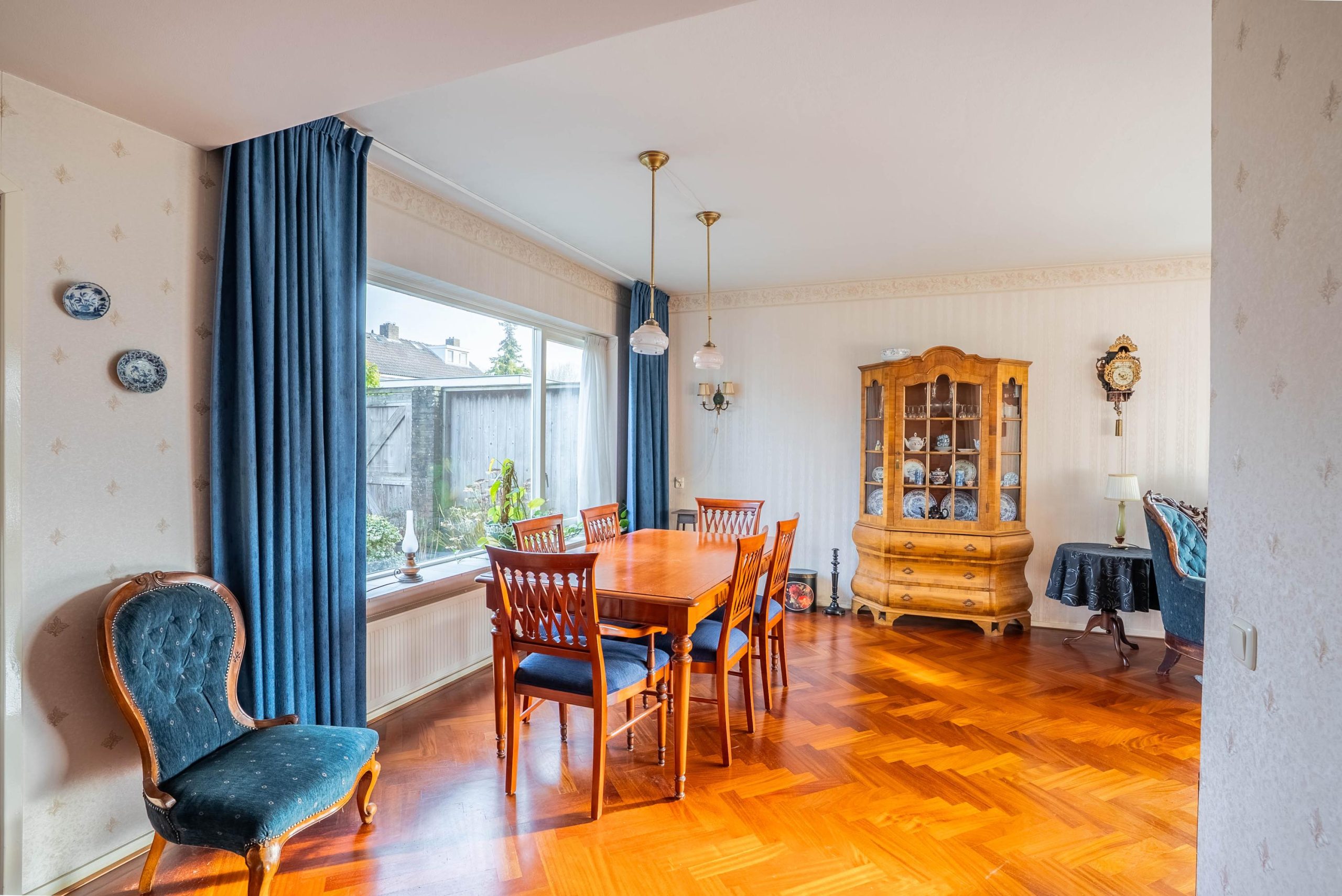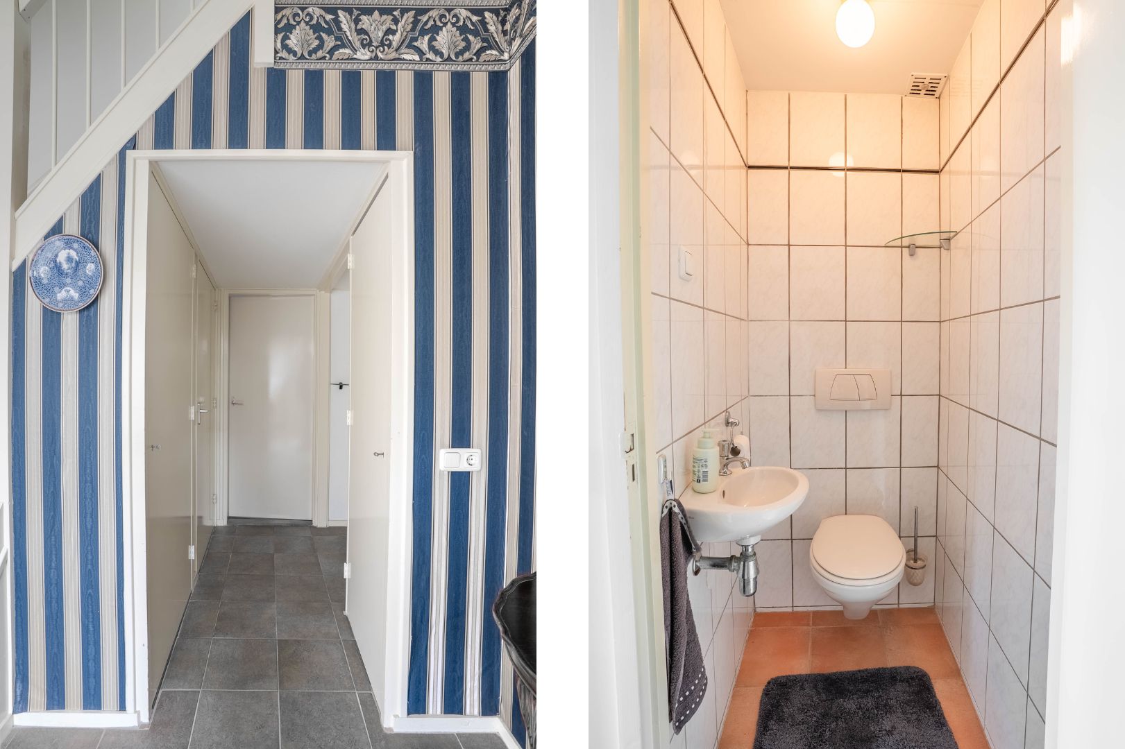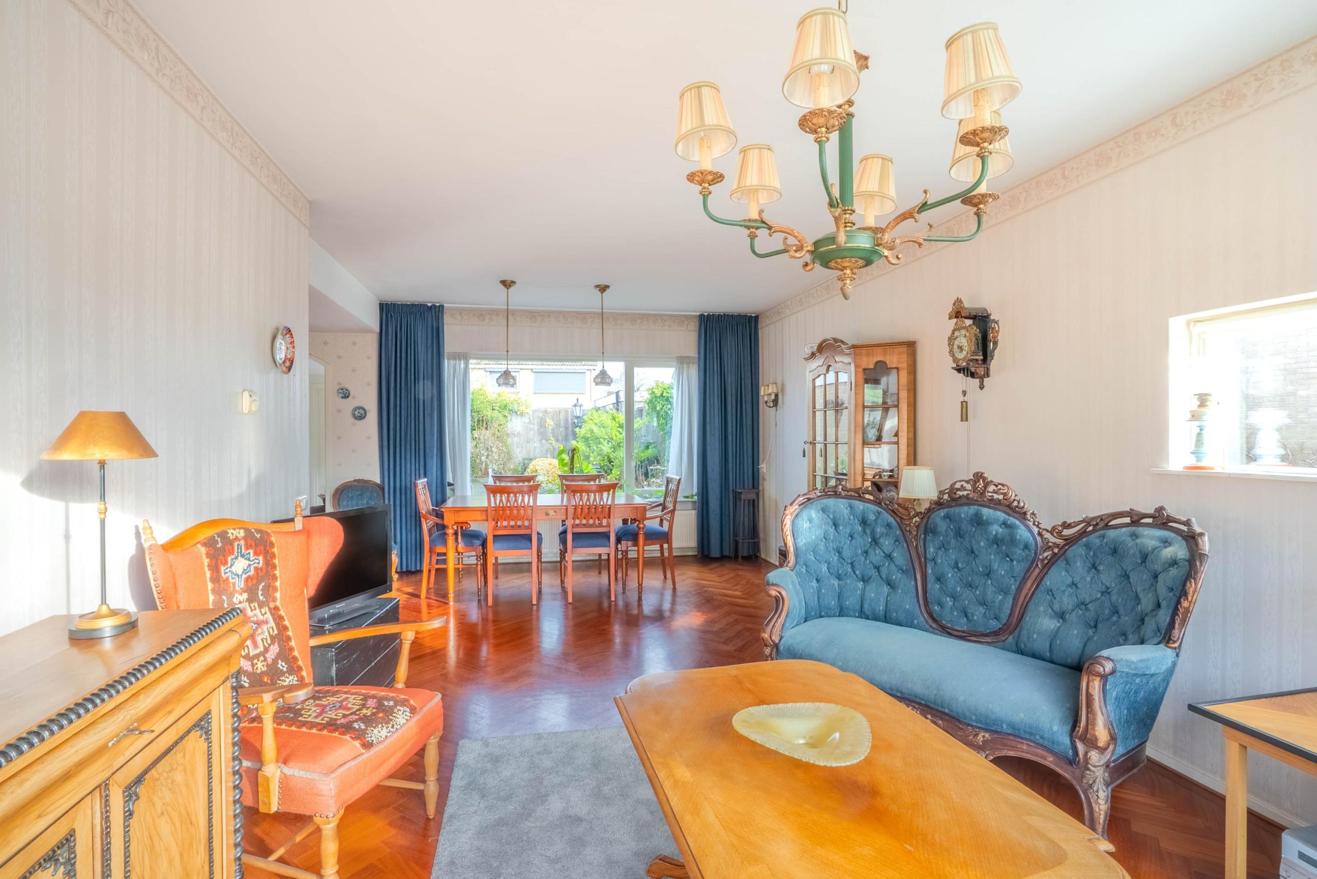 Via de hal/entree met meterkast, toilet en trapopgang bereiken we de L-vormige woonkamer. Een fijne doorzonkamer met veel lichtinval en zicht op groen aan de voorzijde. Aansluitend bevindt zich de gesloten keuken, met daarachter de praktische bijkeuken waar ook de witgoedopstelling is gesitueerd en de achterdeur naar de tuin.