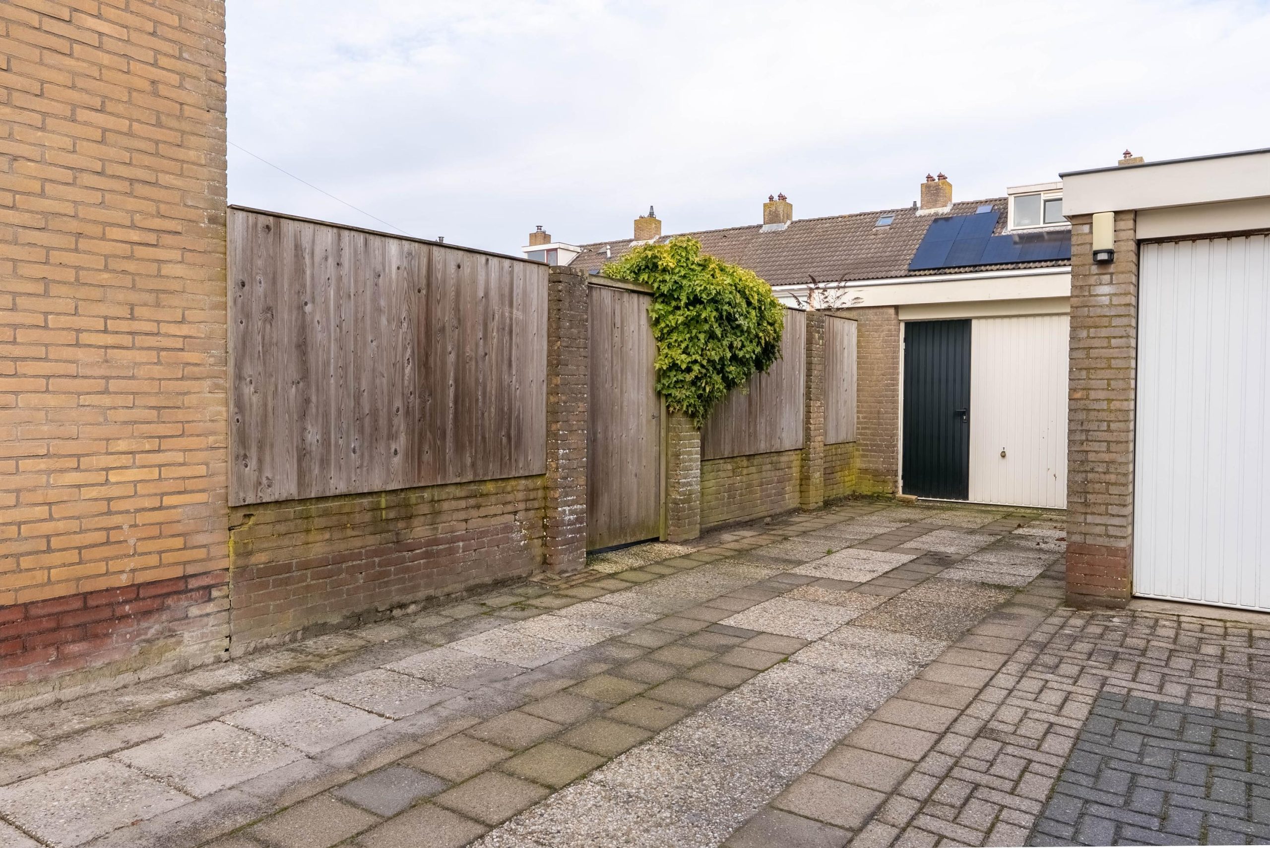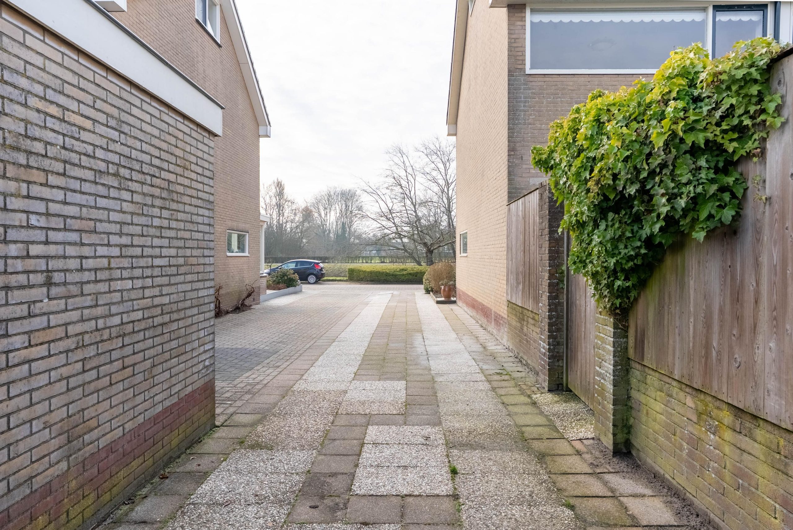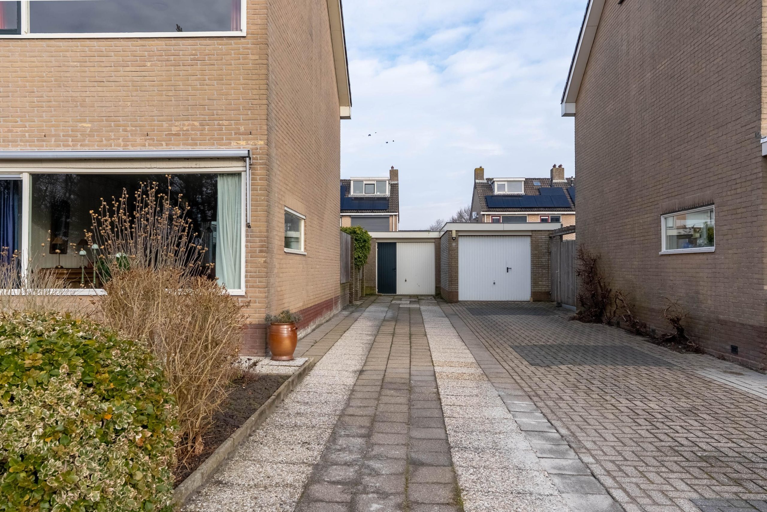 Buiten beschikt de woning over een lange eigen oprit, geschikt voor maar liefst vier voertuigen. Aan het einde daarvan staat een vrijstaande stenen garage (ca. 5,80 x 3,35 meter) met plat dak en elektrische roldeur. De achtertuin is circa 14 meter diep en 10 meter breed — een heerlijke plek voor spelende kinderen, een moestuin of een fraai terras.