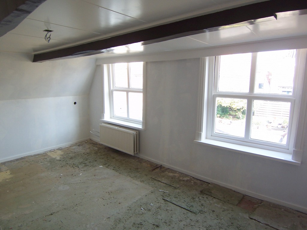 Indeling: woonkamer met balkenplafond en open keuken voorzien van inbouwapparatuur, tuindeuren naar eigen dakterras, opgang naar verdieping.